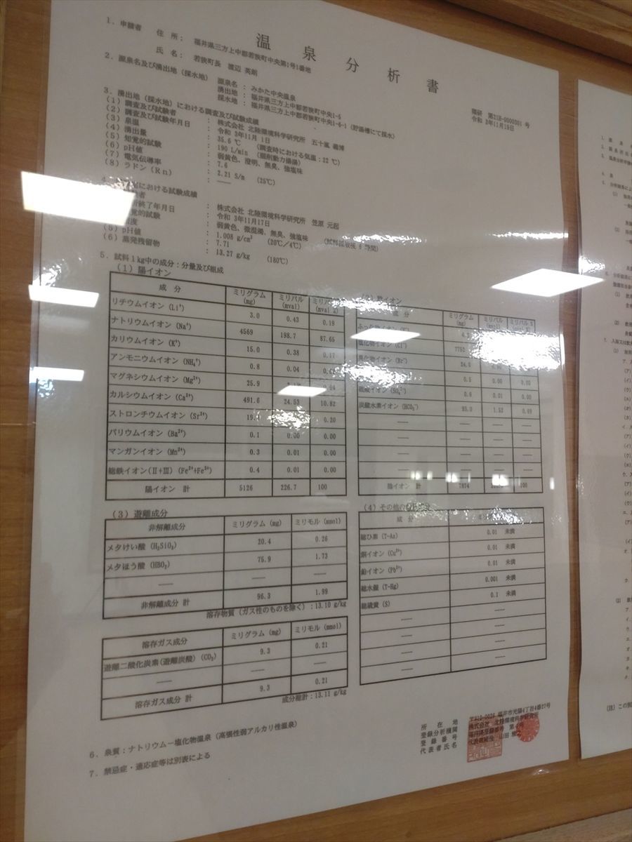 温泉分析表です。ナトリウム-塩化物強塩泉(高張性弱アルカリ性温泉)と書かれています。