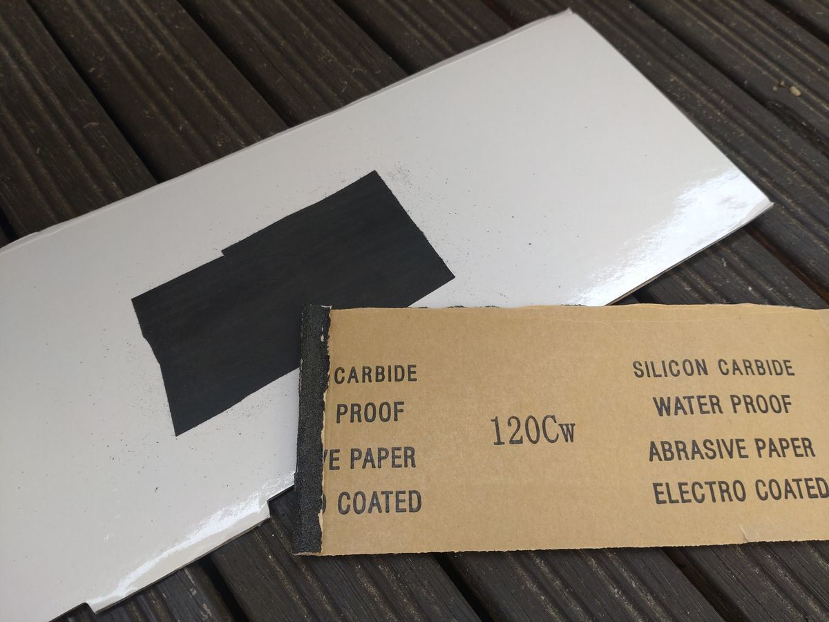 白いツルツルの表面の段ボールにマットブラックのカッティングシートを貼り、塗装が乗りやすいように表面にサンドペーパーを掛けます。