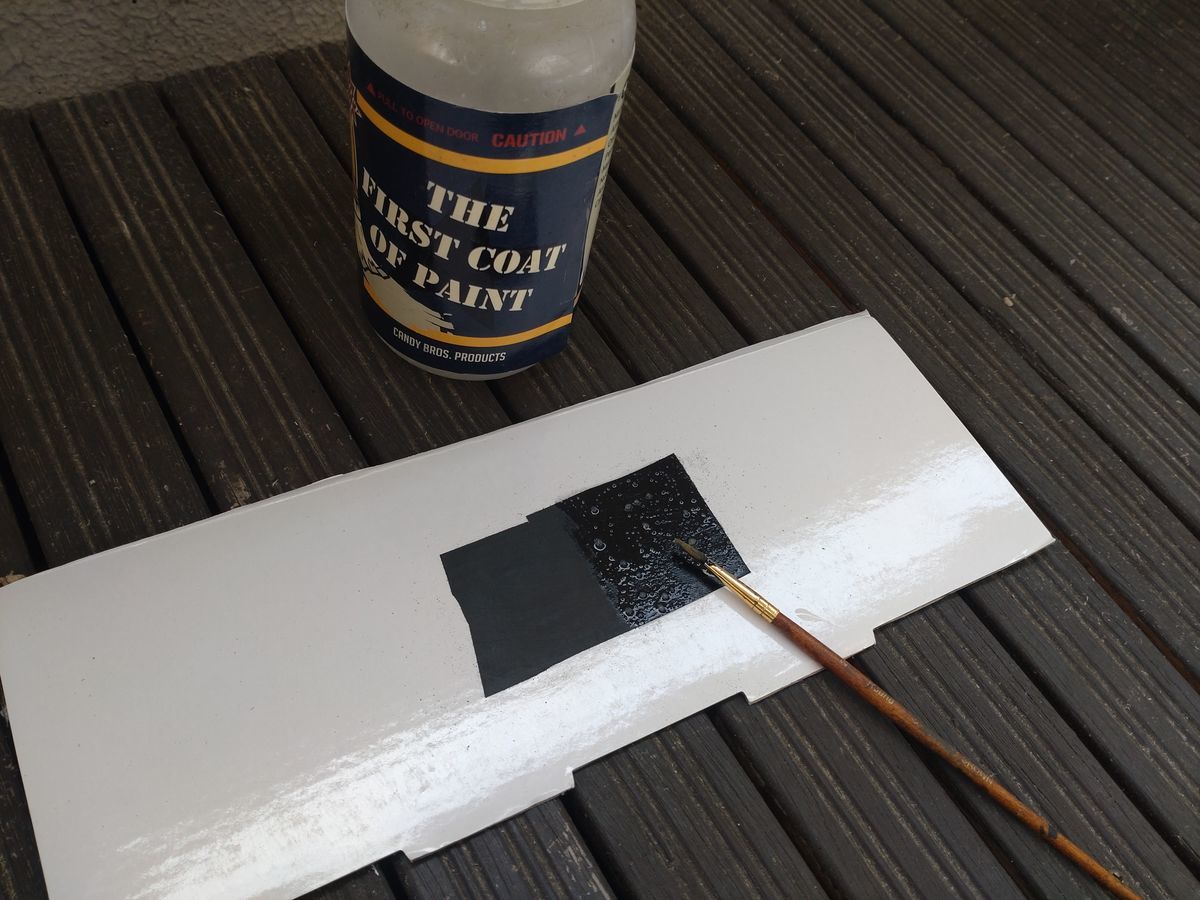 プライマーを塗る塗らないで塗装の着きに差が出るか試すため、右半分にプライマーを塗り乾燥させます。