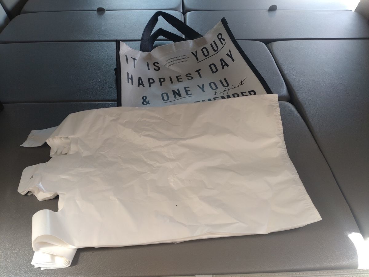 ①の白い紙バックにはゴミや買い物品を入れるレジ袋を入れています。