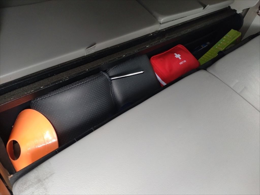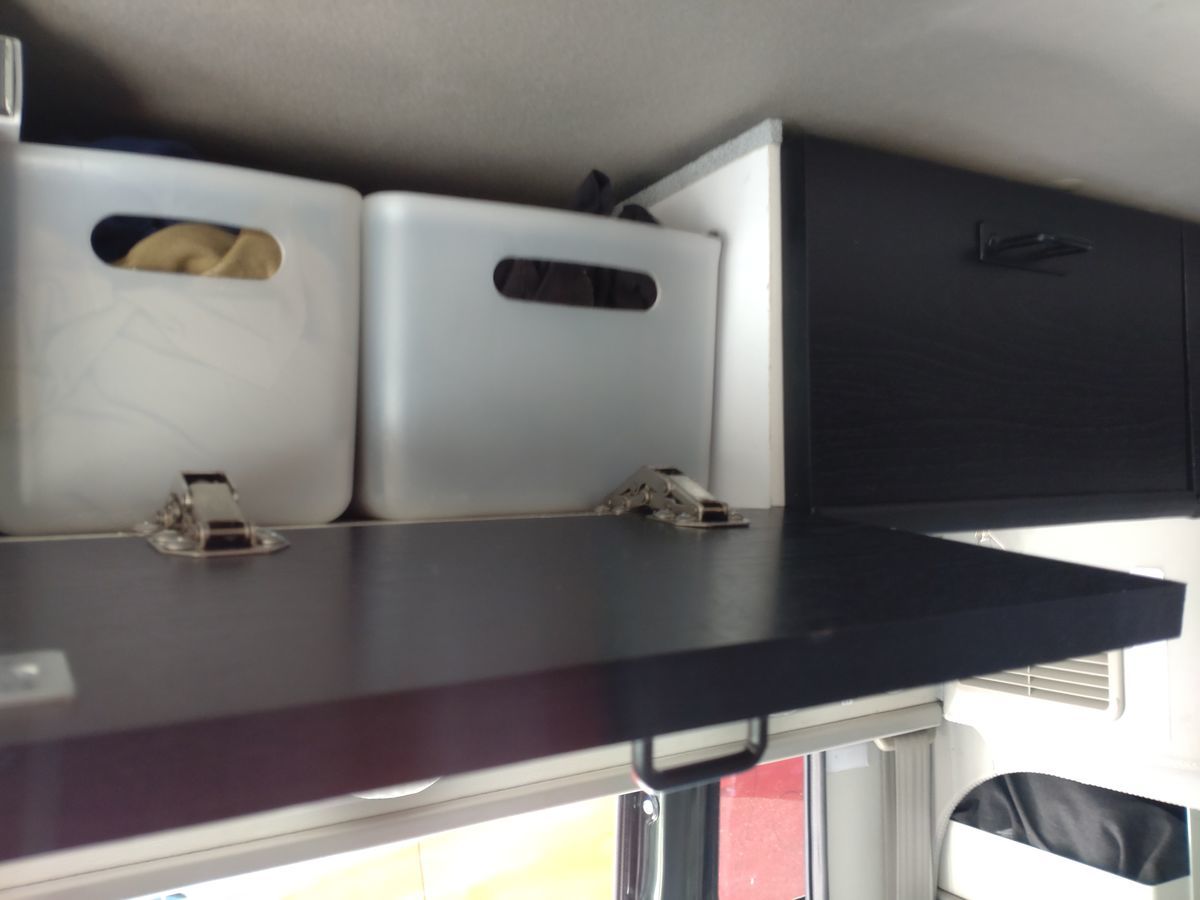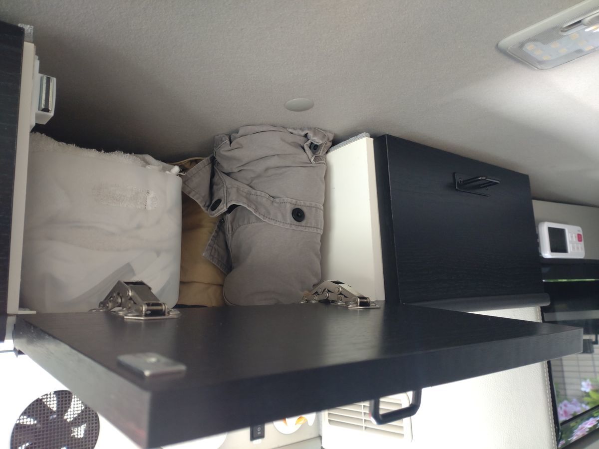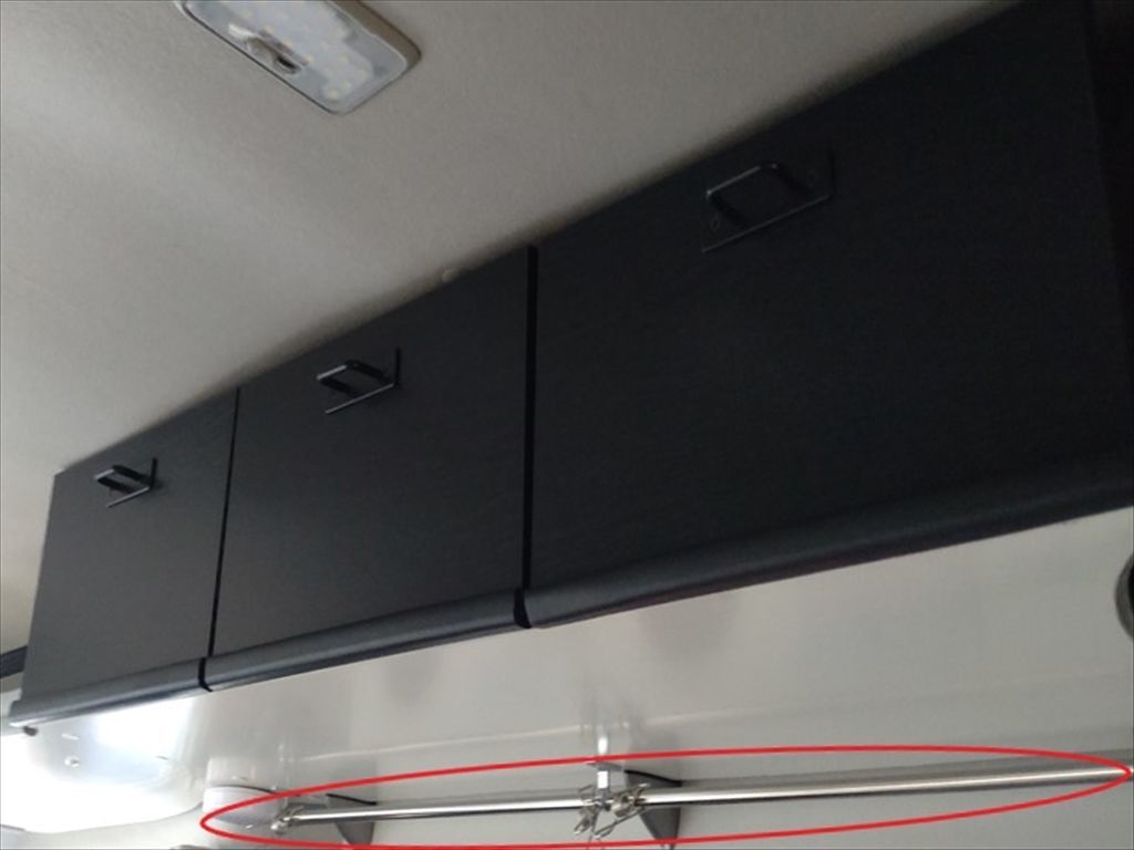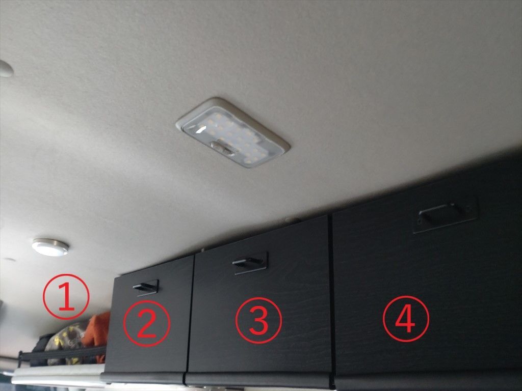運転席上部は扉無しの棚で後方は3か所に分けて扉をつけています。