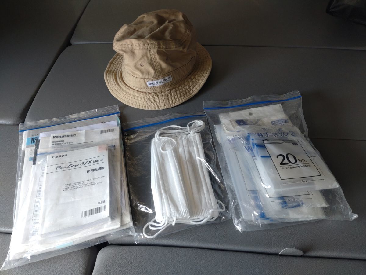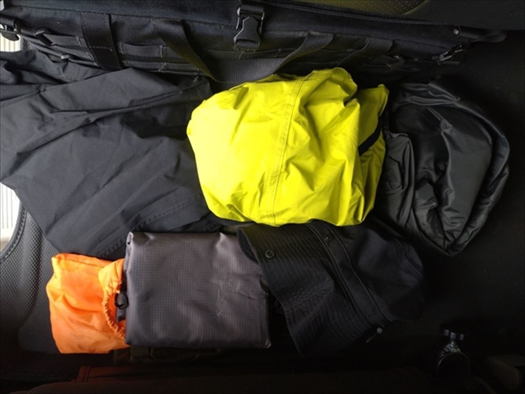 写真ではわかりにくいですが、レインウエア、撥水加工シート、ドライバック、無印良品の防水サファリハットを入れています。