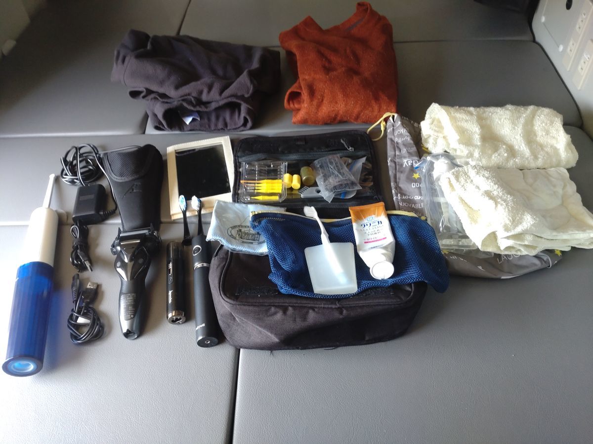 トラベルポーチには電気シェーバー、エチケットカッター、電動歯ブラシ、ハンディーシャワートイレ、手鏡などを入れています。