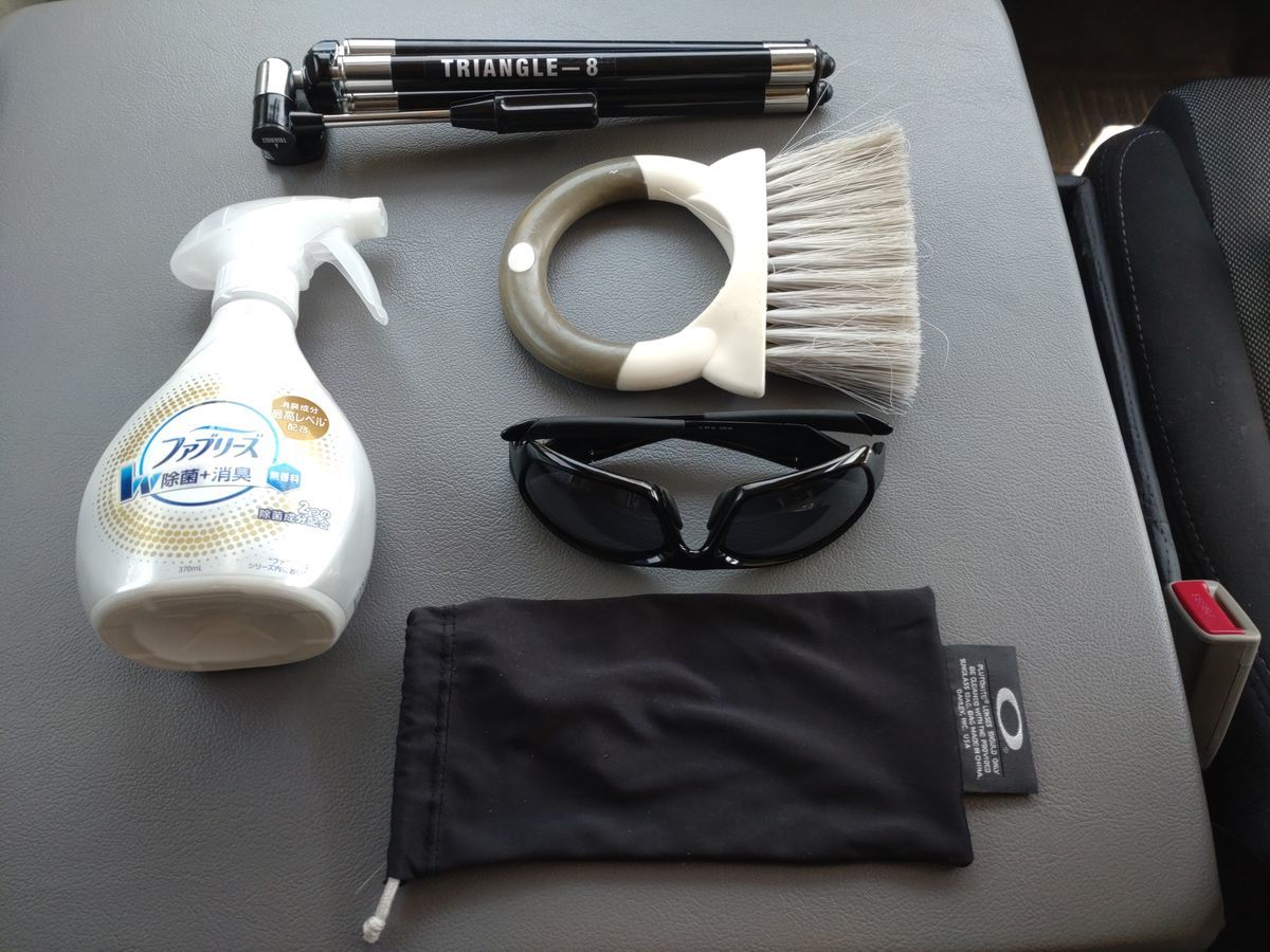 三脚、サングラス、ミニほうき、消臭剤を置いています。