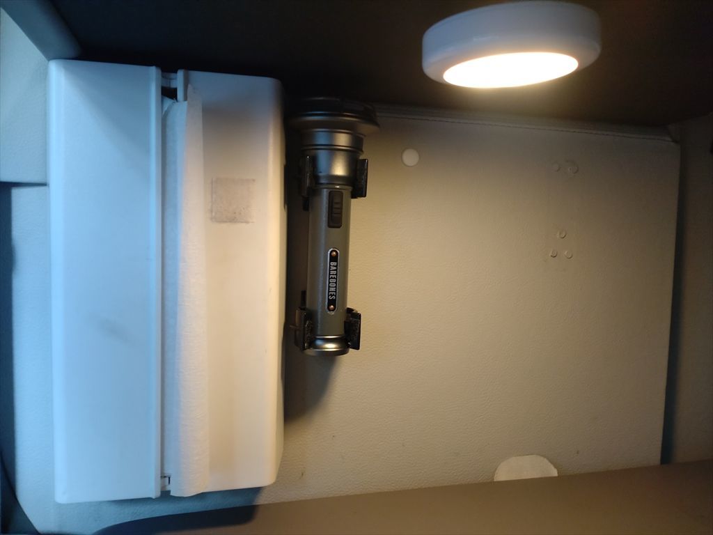 夜に外回りを点検したり確認する場合や真っ暗な中を歩く時などのために明るいフラッシュライトをつけています。