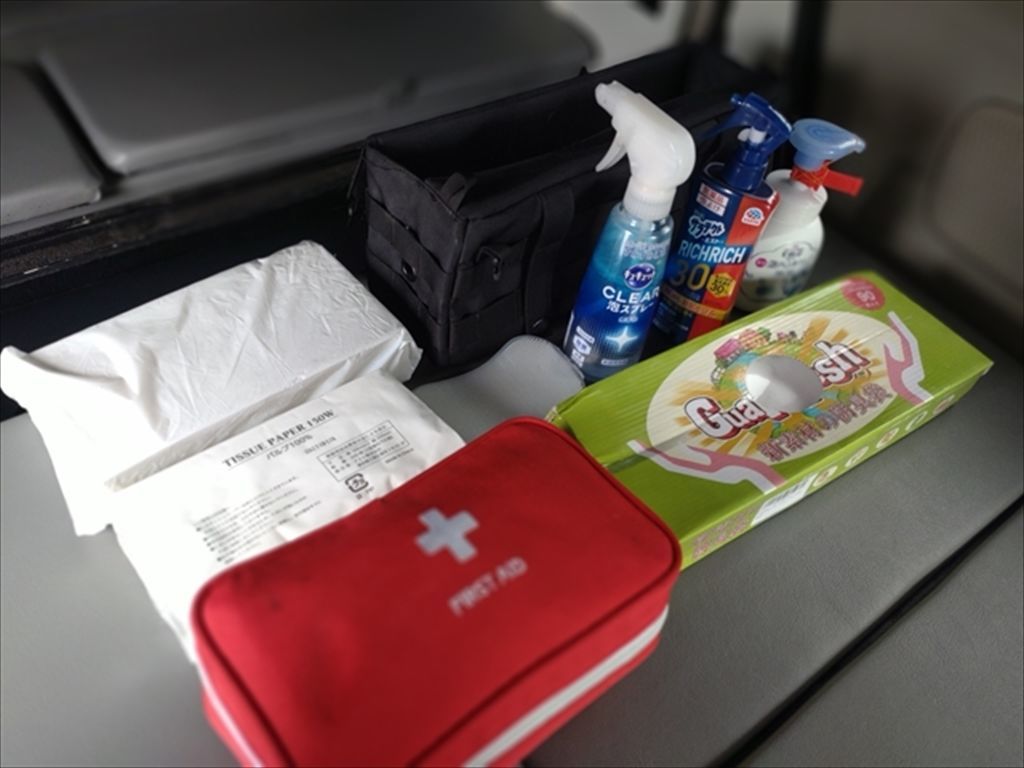 市販薬やカットバンなどを入れた救急バック、防臭ビニル袋、ソフトパックティッシュペーパーとソフトパックペーパータオルを各々予備1個を置いています。