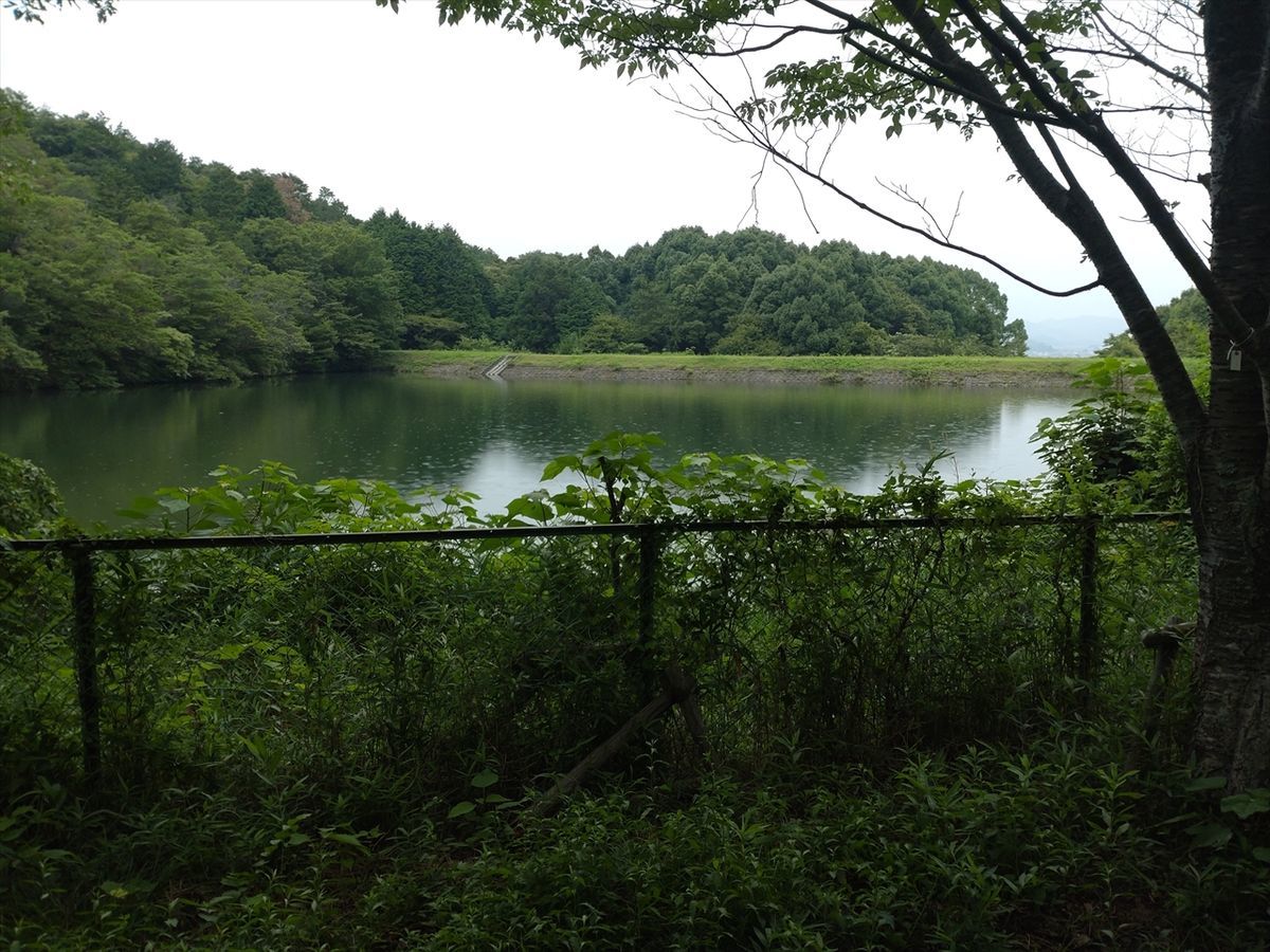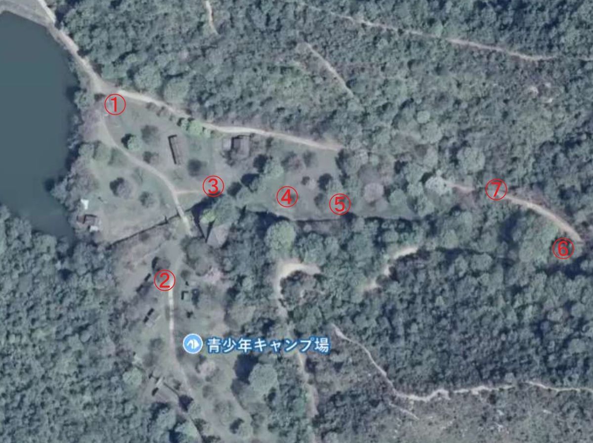 地図⑭辺りです。管理建物やため池横のキャンプエリアが見えます。