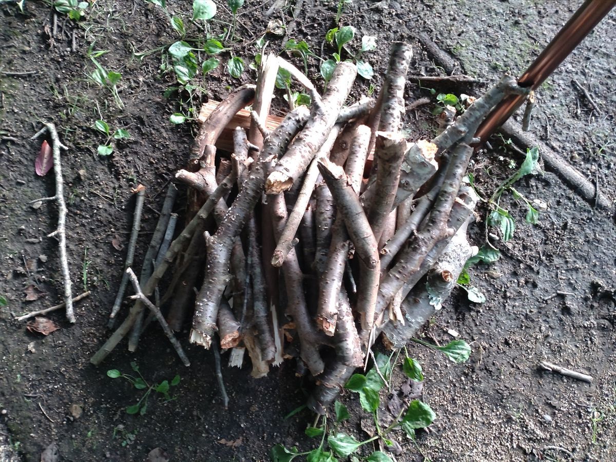 燃えやすいように最初はティピー型に細めの枝を立てて組んでいます。