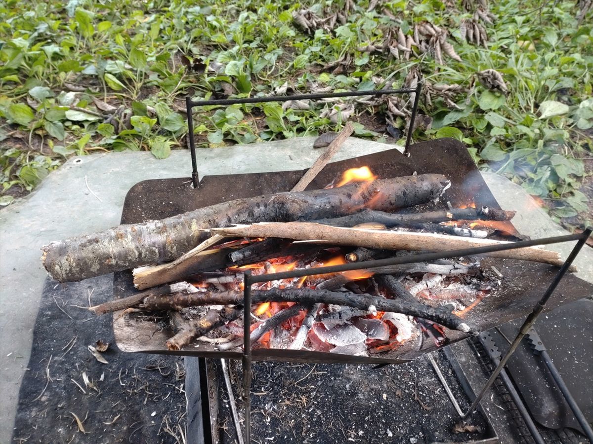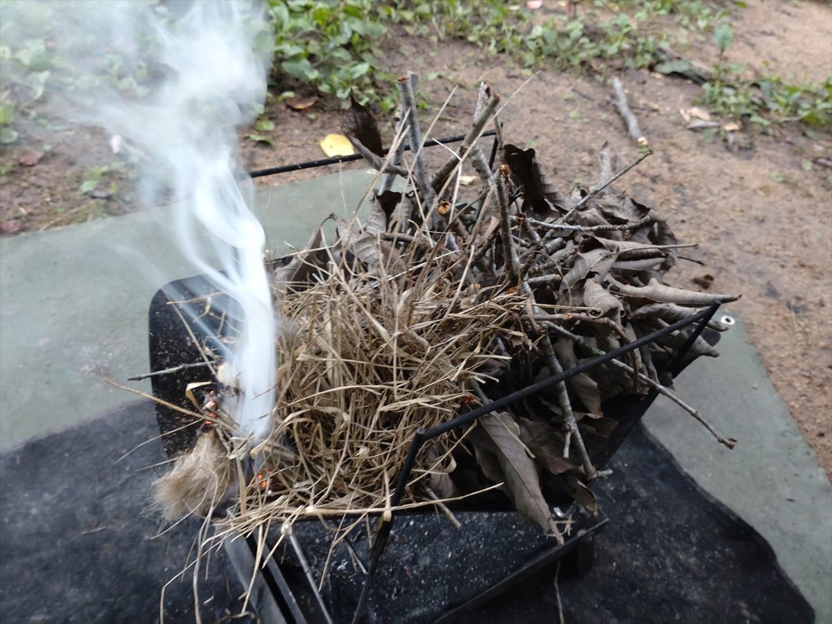 乾いた薪で焚火を起こすのと違い、最初の燃えやすいモノからの炎では、拾ってきた木の枝に勢いよく燃え広がりませんね(^^)
