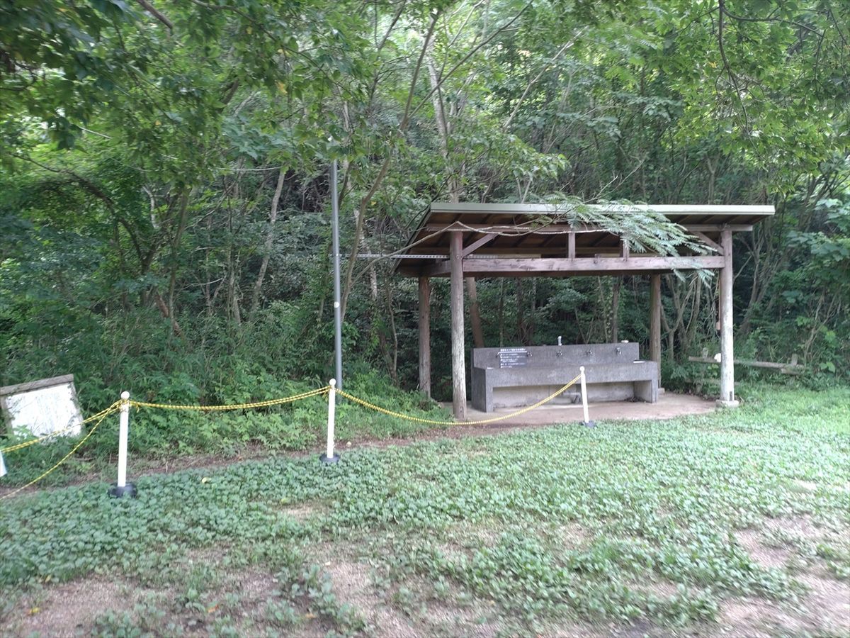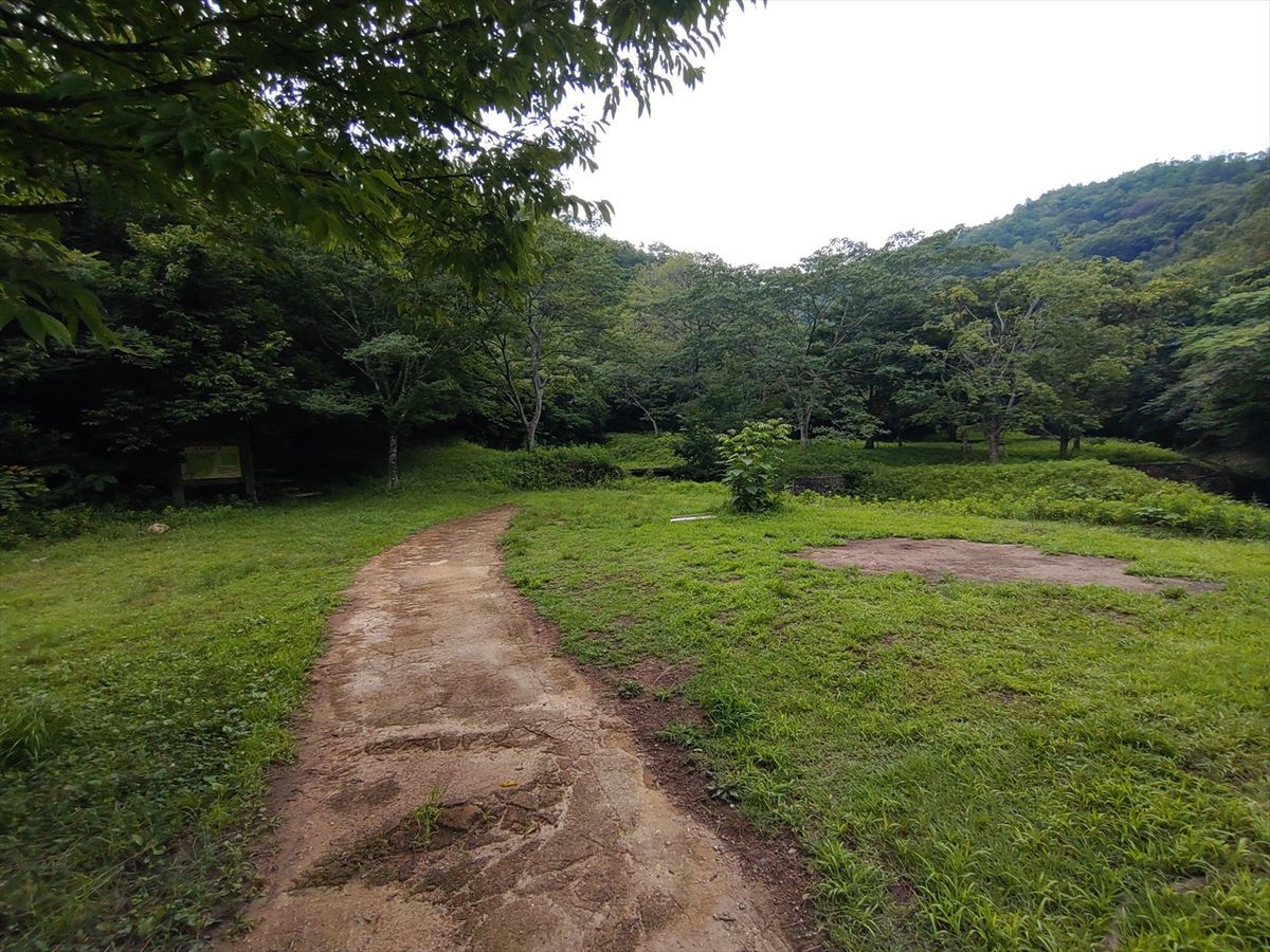 荒れた道を少し上がって行くとキャンプエリアが見えてきます。(後で出てくる地図①辺りです。)