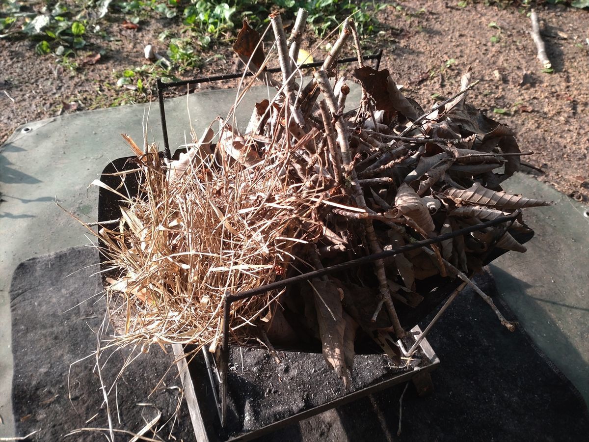 燃やすモノが全般に湿っていて火が点きにくそうなので、中にはカンナ削りカスなども入れています。