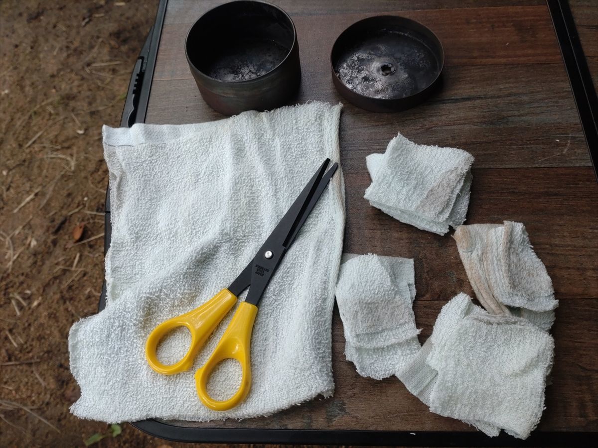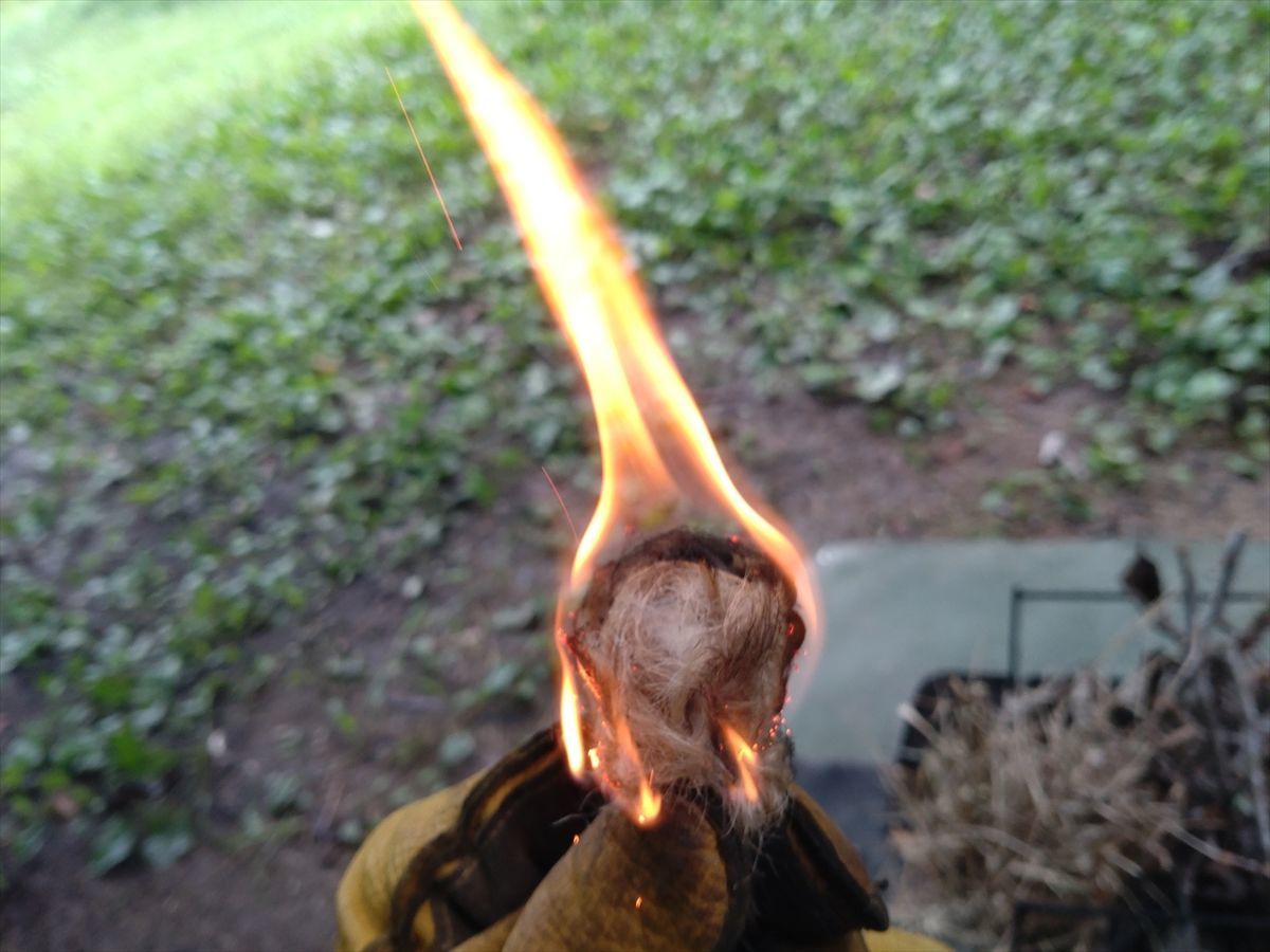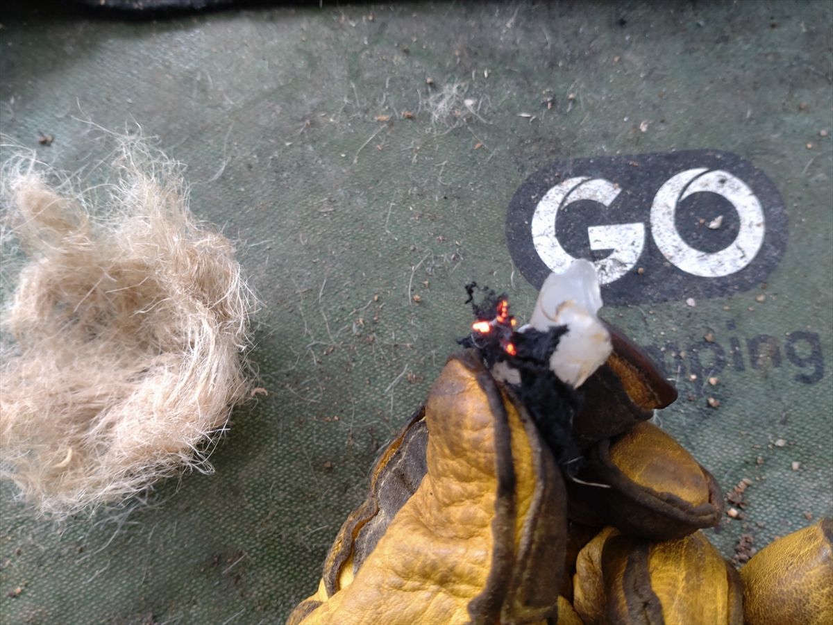 いい感じでタオルが炭化し、火花が点き易そうなチャークロスが出来ています。