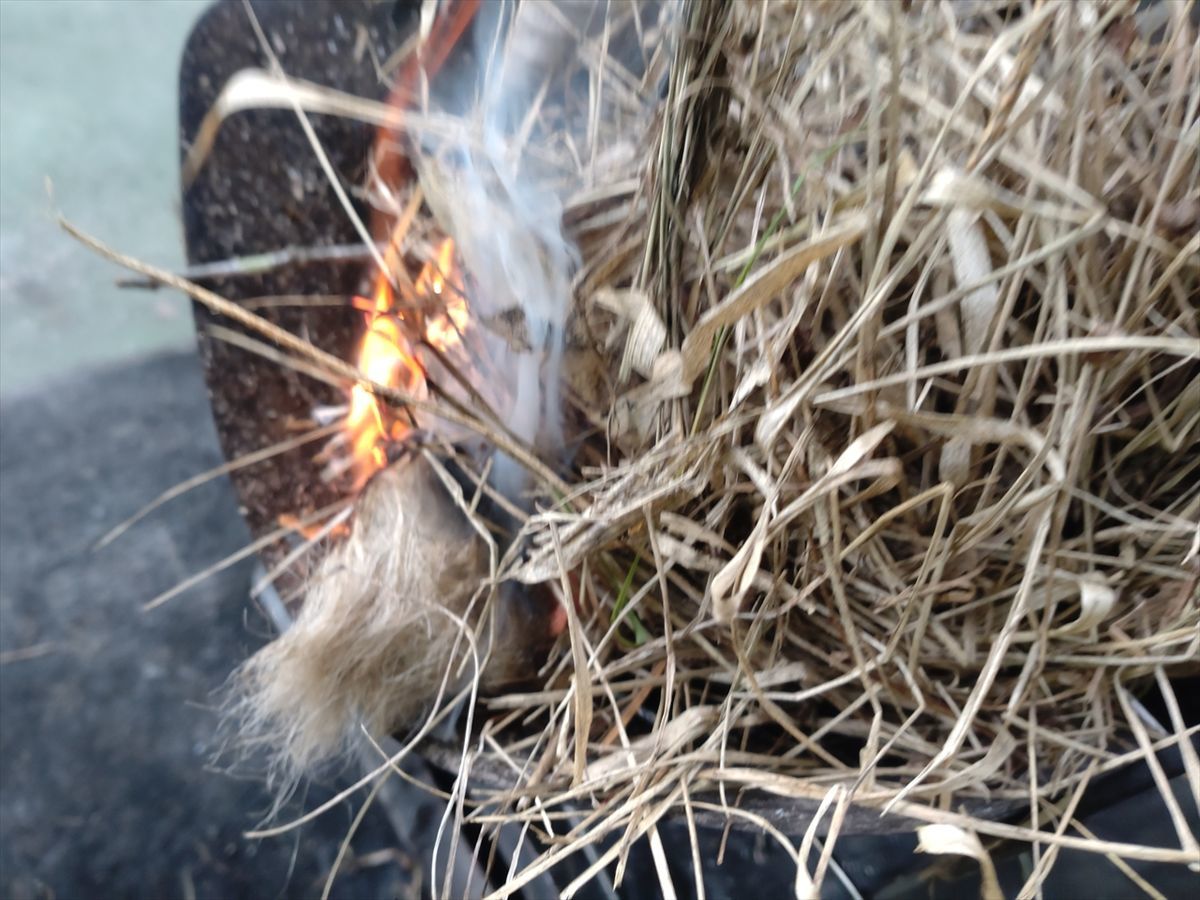 チャークロスに火花が点いたら枯れて乾いた草で包んで息を吹きかけて炎を出しています。