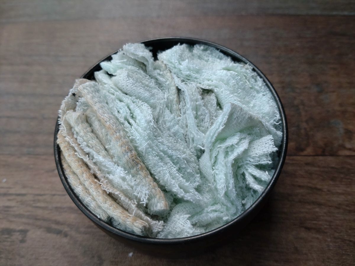 左は目が細かい繊維から作ったのもので、右がタオルの繊維の目が粗いものから作ったチャークロスです。