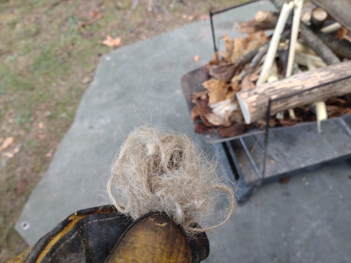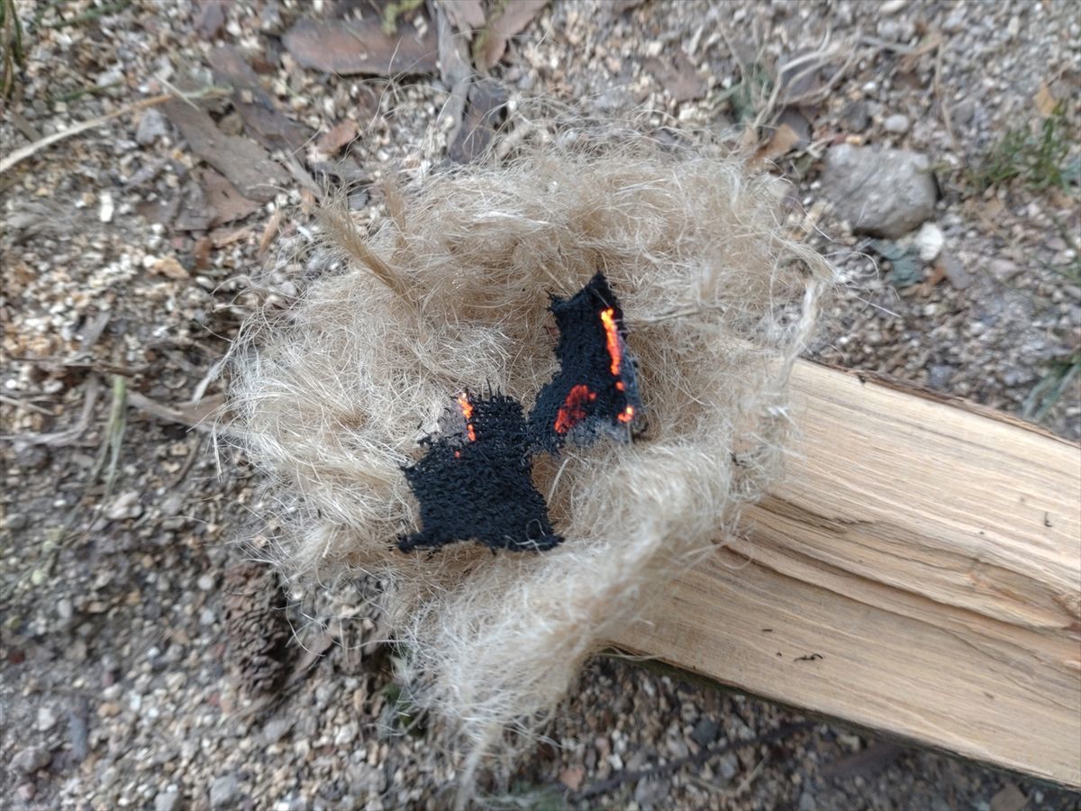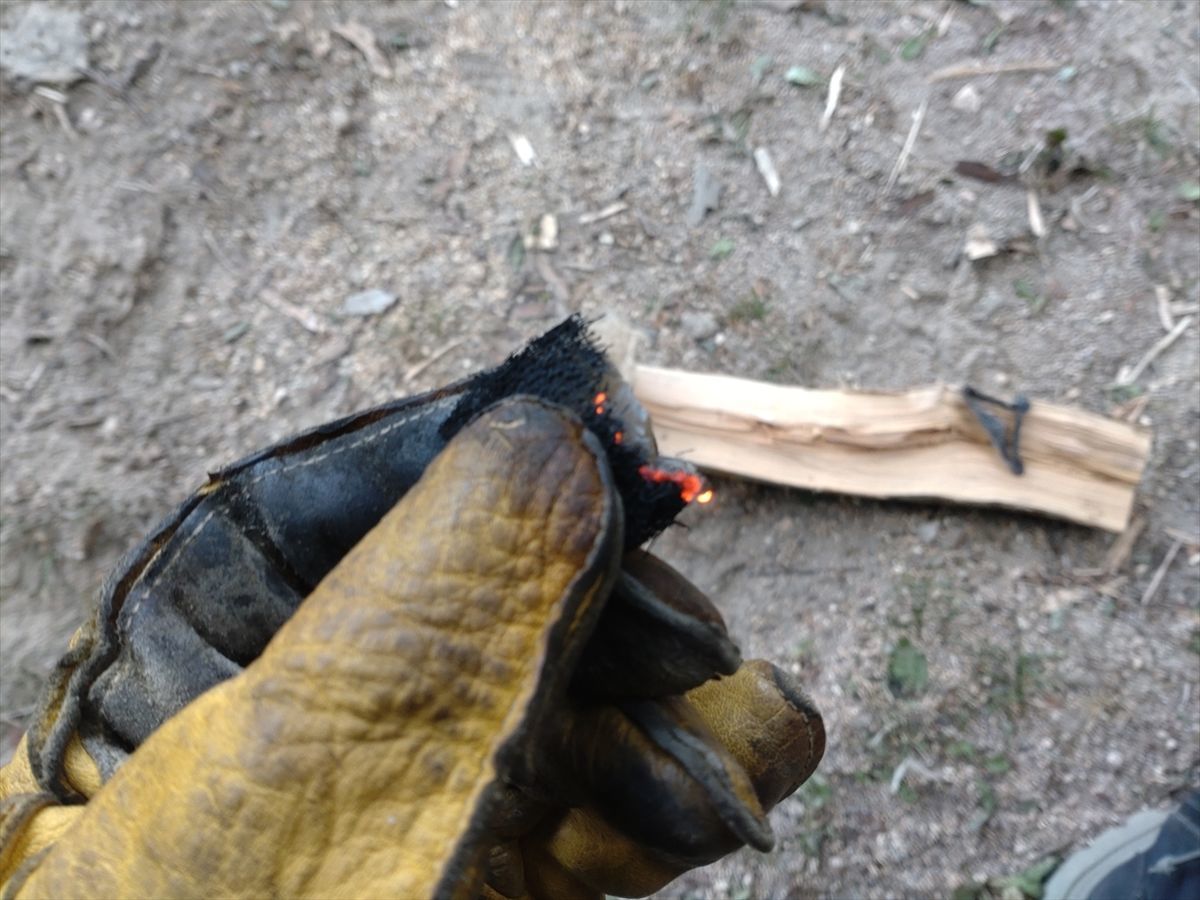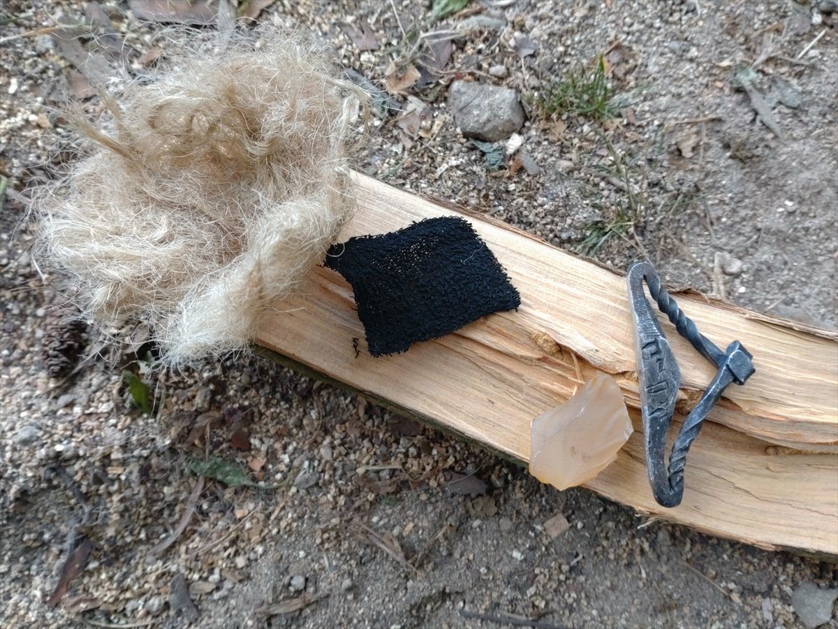 昨日は苦戦しましたが、今日は火打石に火打鎌を2回打ち付けた火花でチャークロスに着火しました(^^)