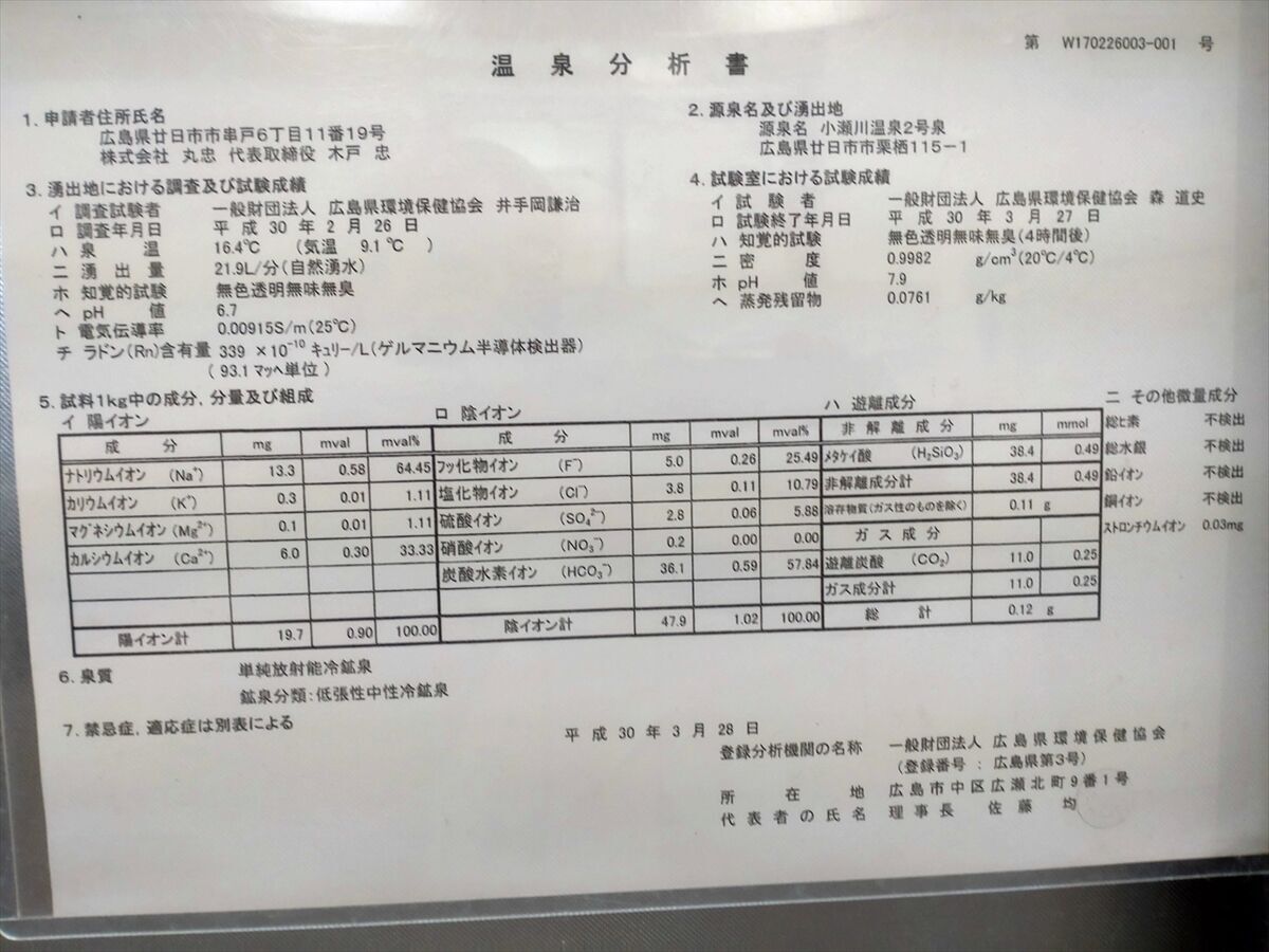 温泉分析表です。単純弱放射能冷鉱泉(低張性中性冷鉱泉)と書かれています。