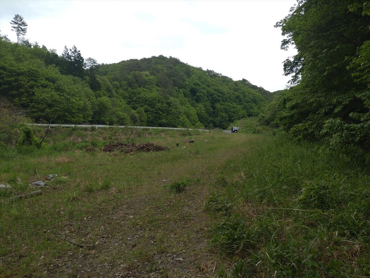 車を道路脇の空き地に置いて廃道を歩き始めて振り返ったところです。この辺りはなんてことありませんね。