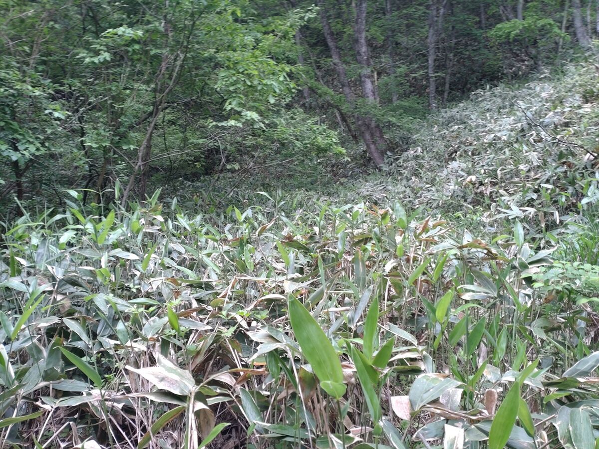 笹が一面に生えていてどこが歩く所か良くわからない廃道の藪漕ぎが結構長く続きます(^^;