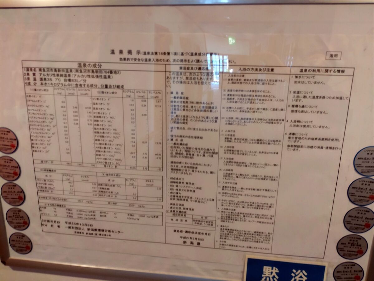 温泉分析表です。アルカリ性単純温泉(アルカリ性低張性温泉)と書いてあります。