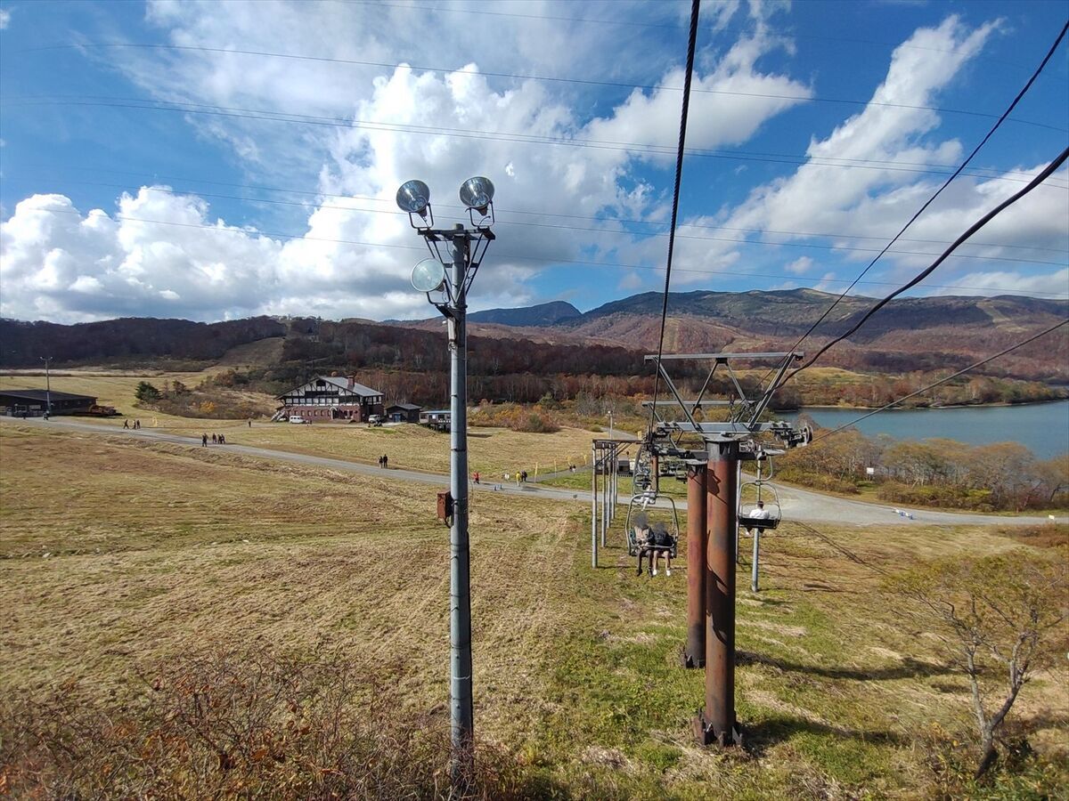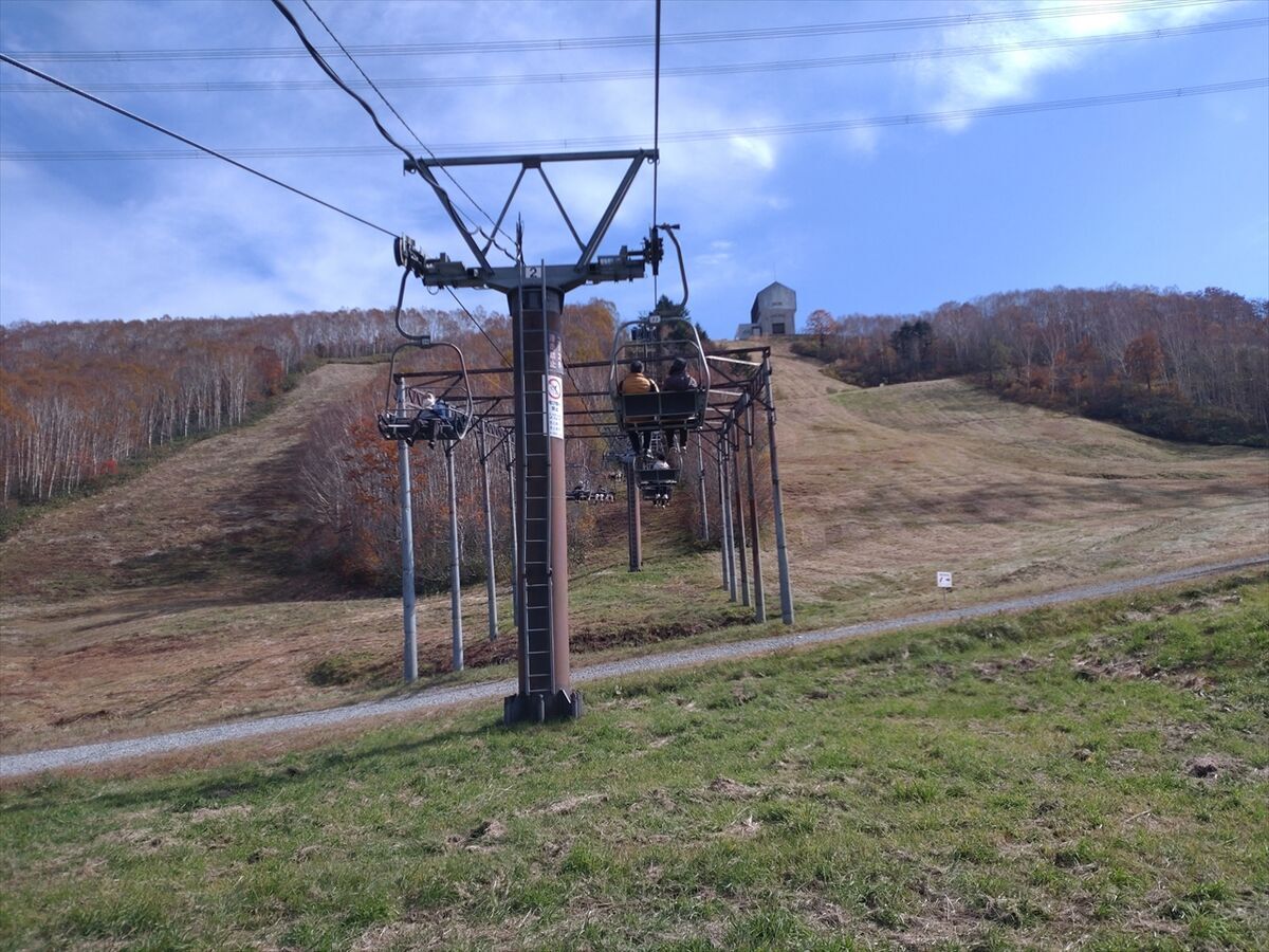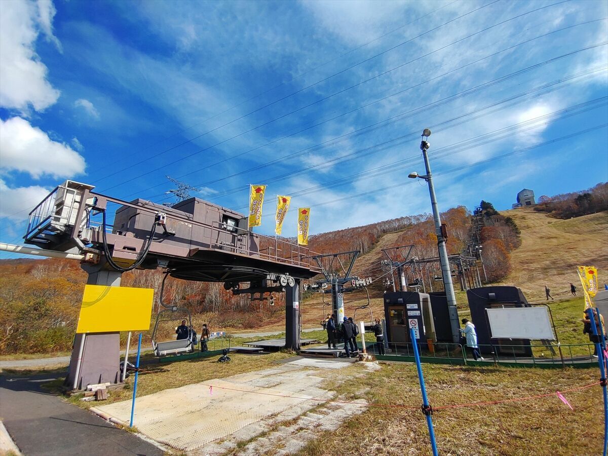 冬ならここから滑り下りてこのリフトを上がってくることになりますが、観光用に下りる方の乗車も出来ます。下りる方は一人乗車なのでなかなかお客さんがはけていきませんね(^^;