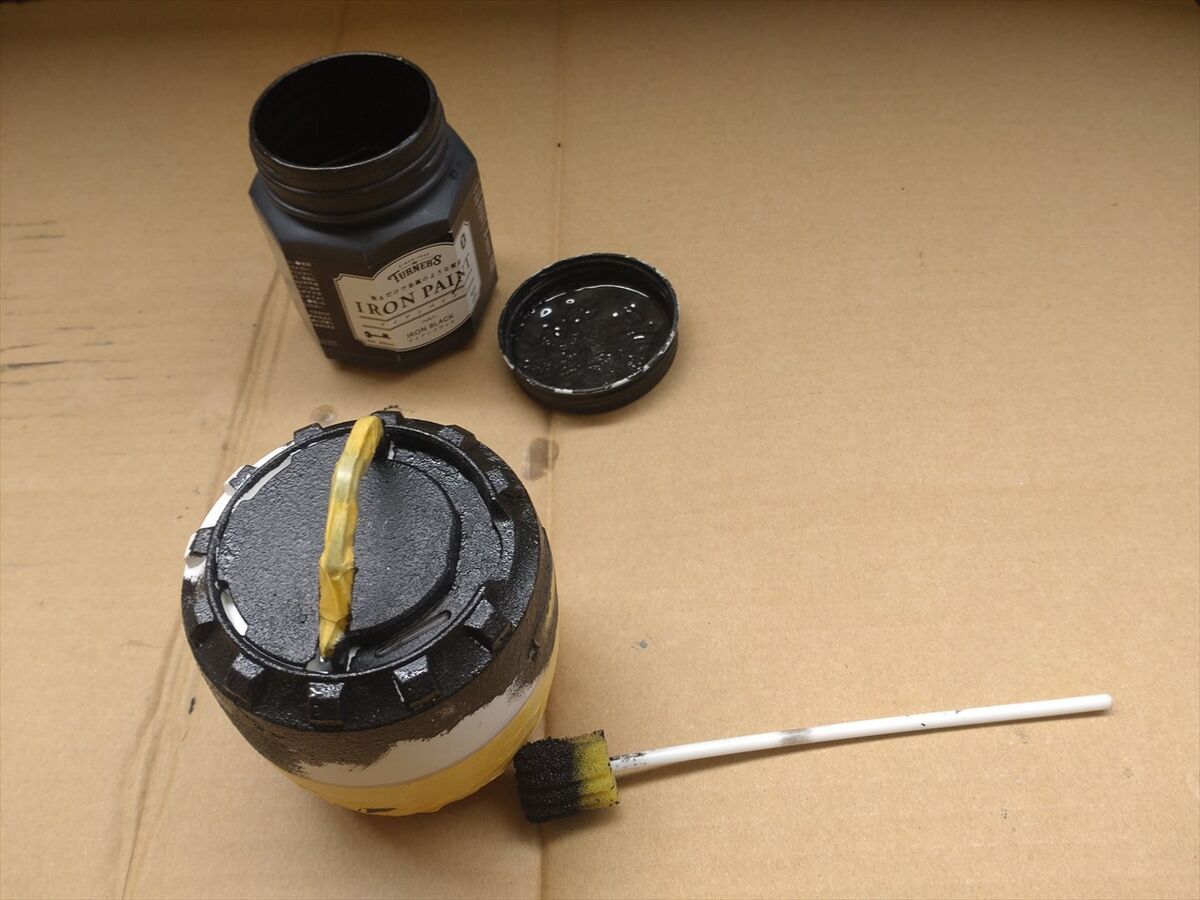 今回はアーミータンクグリーン塗料にせず、アイアンブラック塗料を使い、口腔ケアスポンジを流用して叩くように塗って行きます。スポンジで叩くように塗ることで塗装表面が凸凹になり鉄のような雰囲気が出ます(^^)