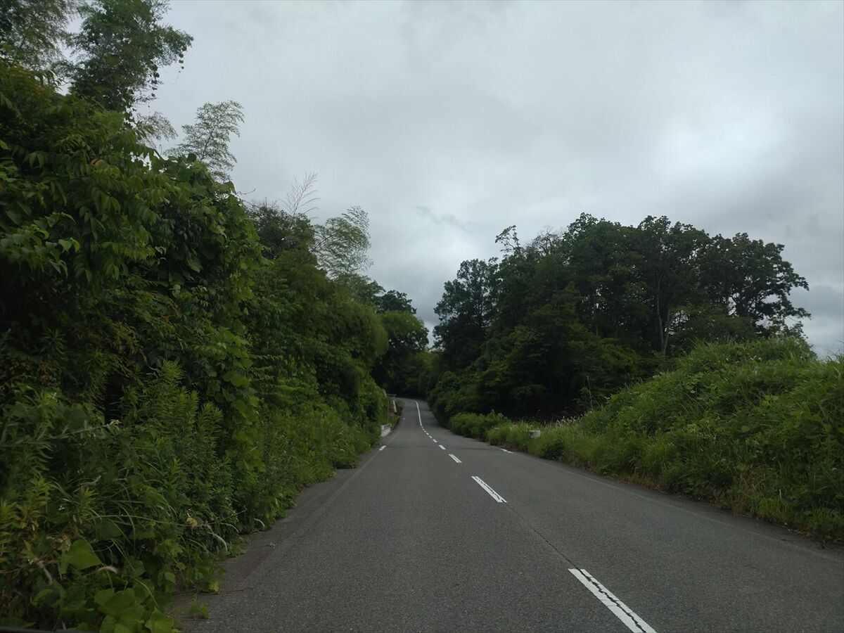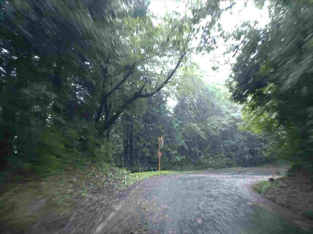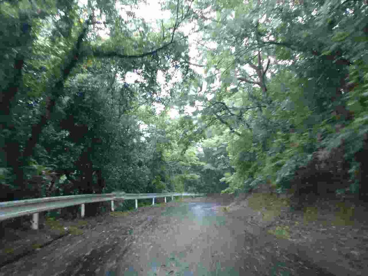 キャンプサイトを出て坂を下っていると、昨日までの大雨で道路の路肩が大きく陥没していました(^^;