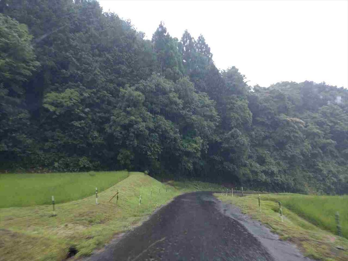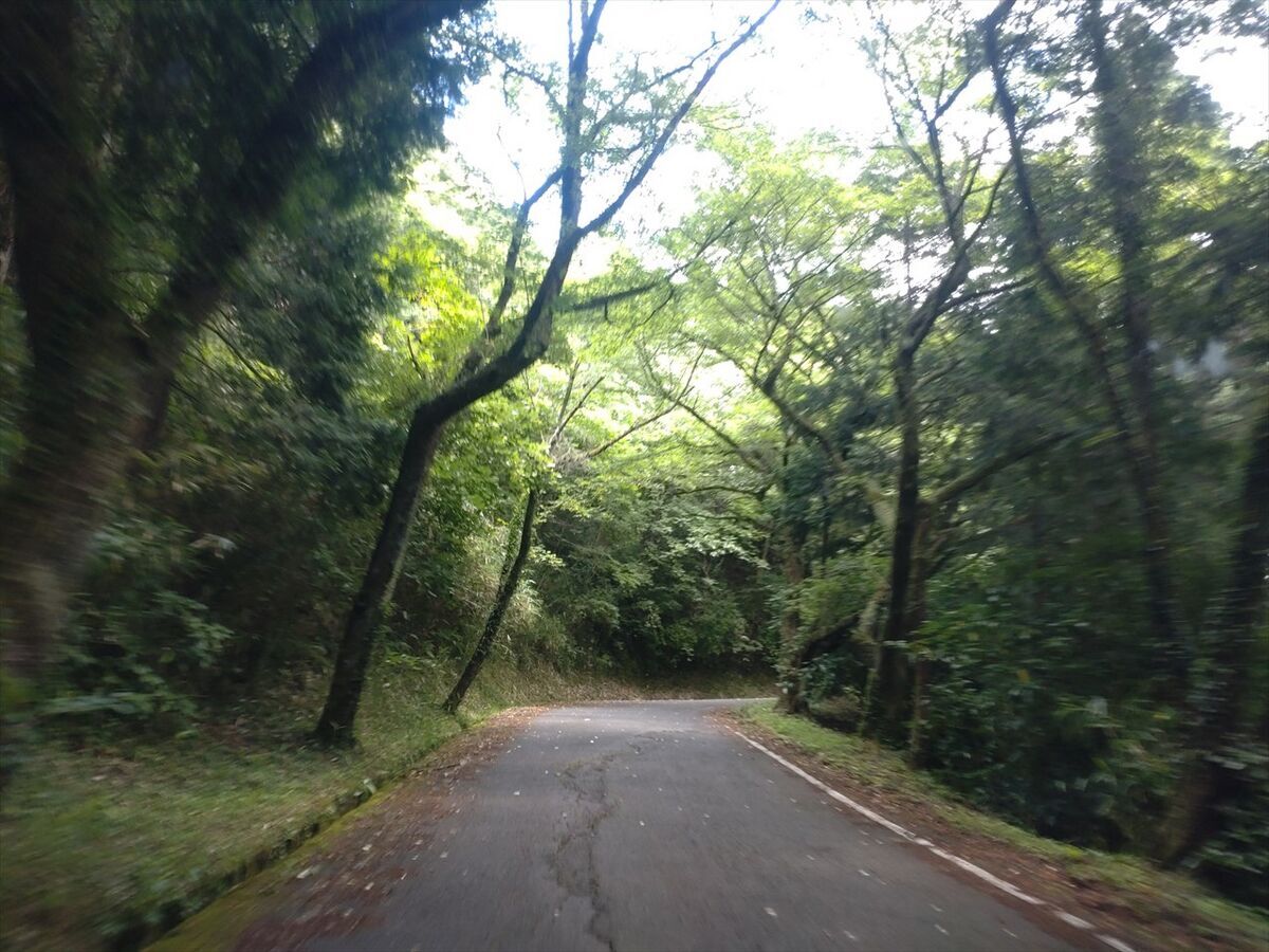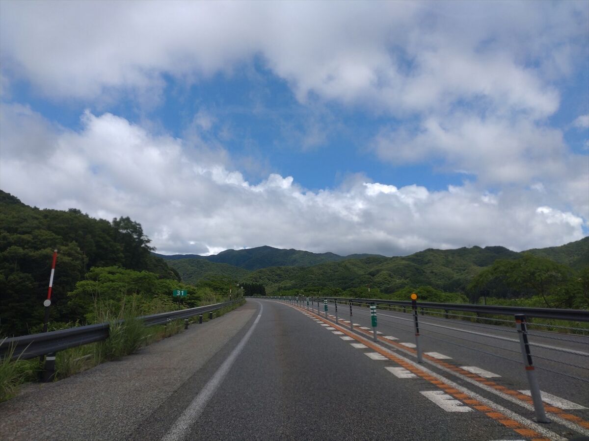 キャンプサイトを出て坂を下っていると、昨日までの大雨で道路の路肩が大きく陥没していました(^^;
