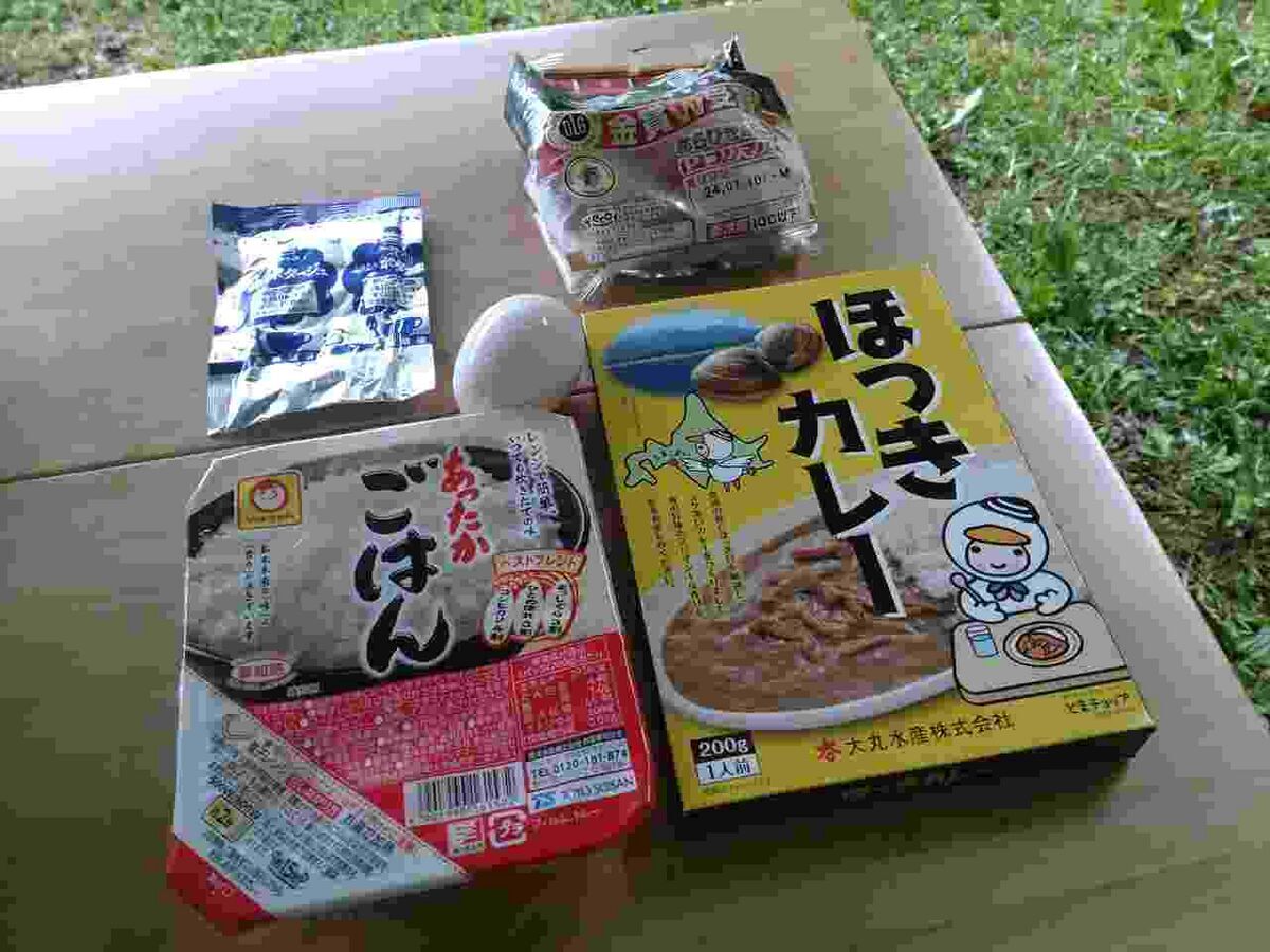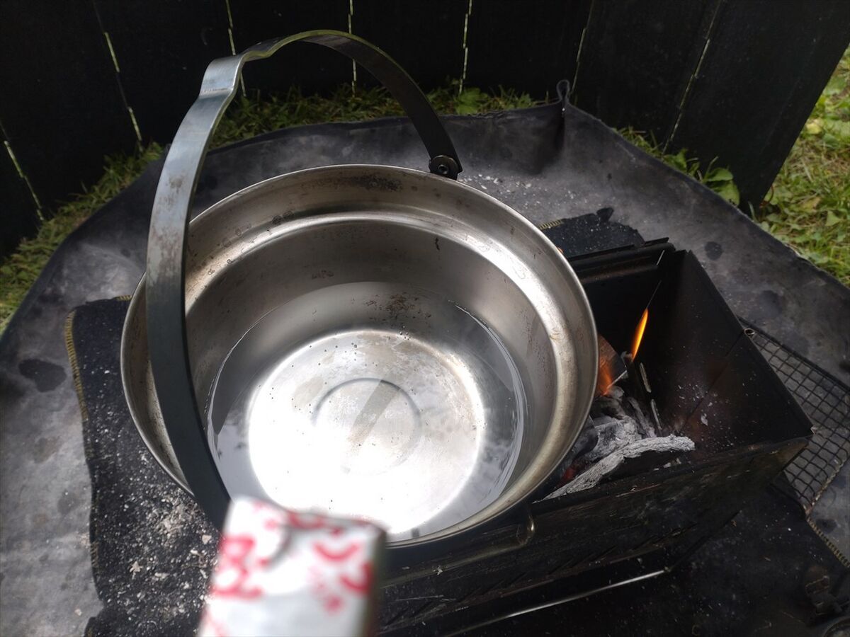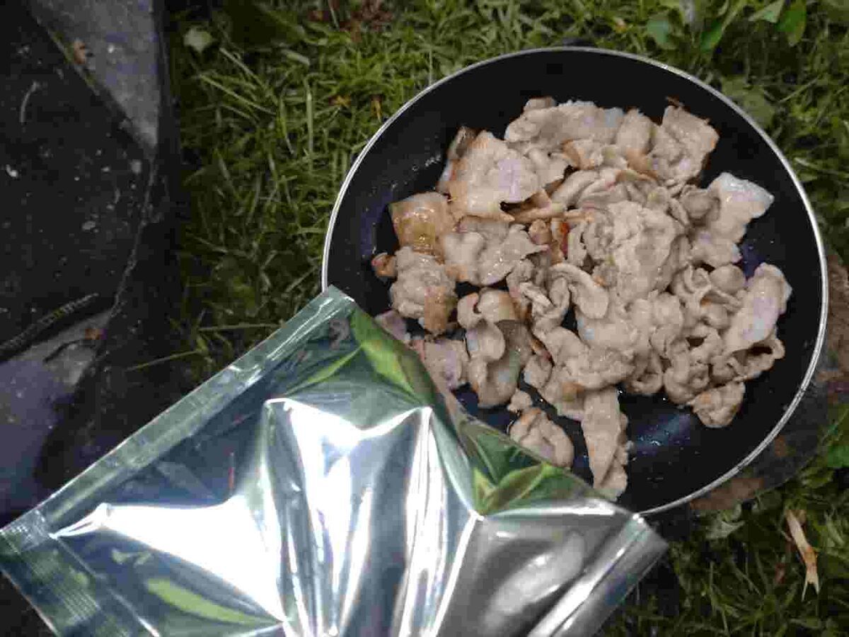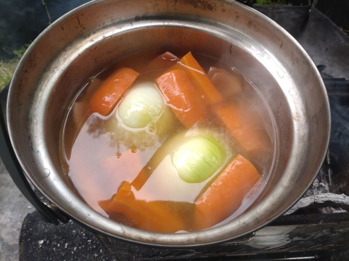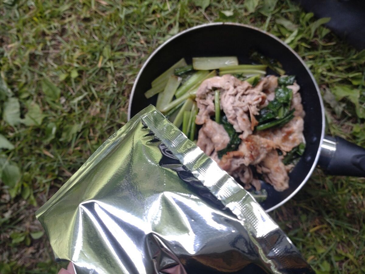 フライパンで湯を沸かしレトルトご飯とカレーを温めます。