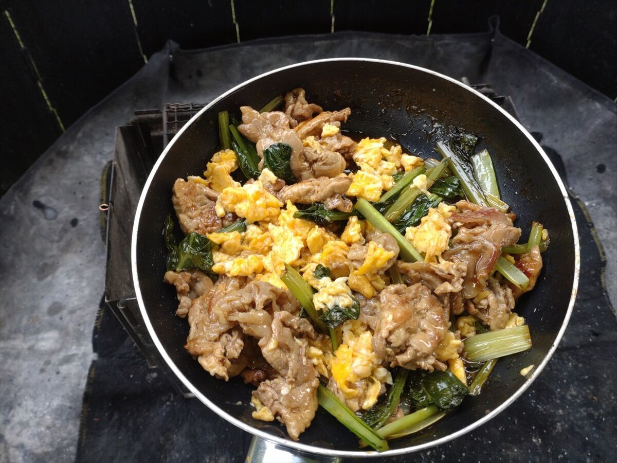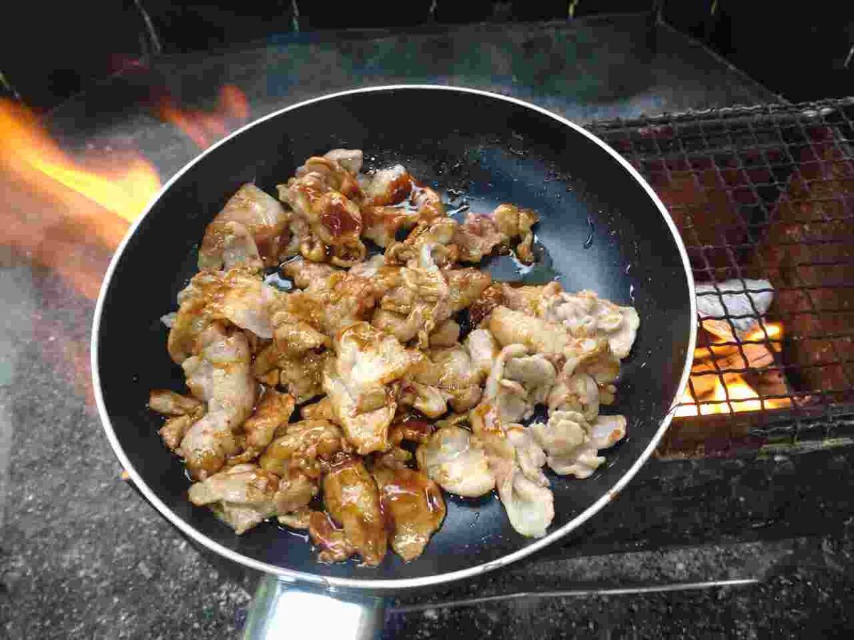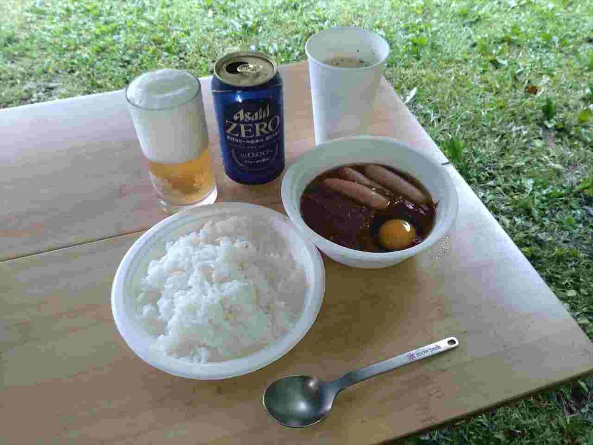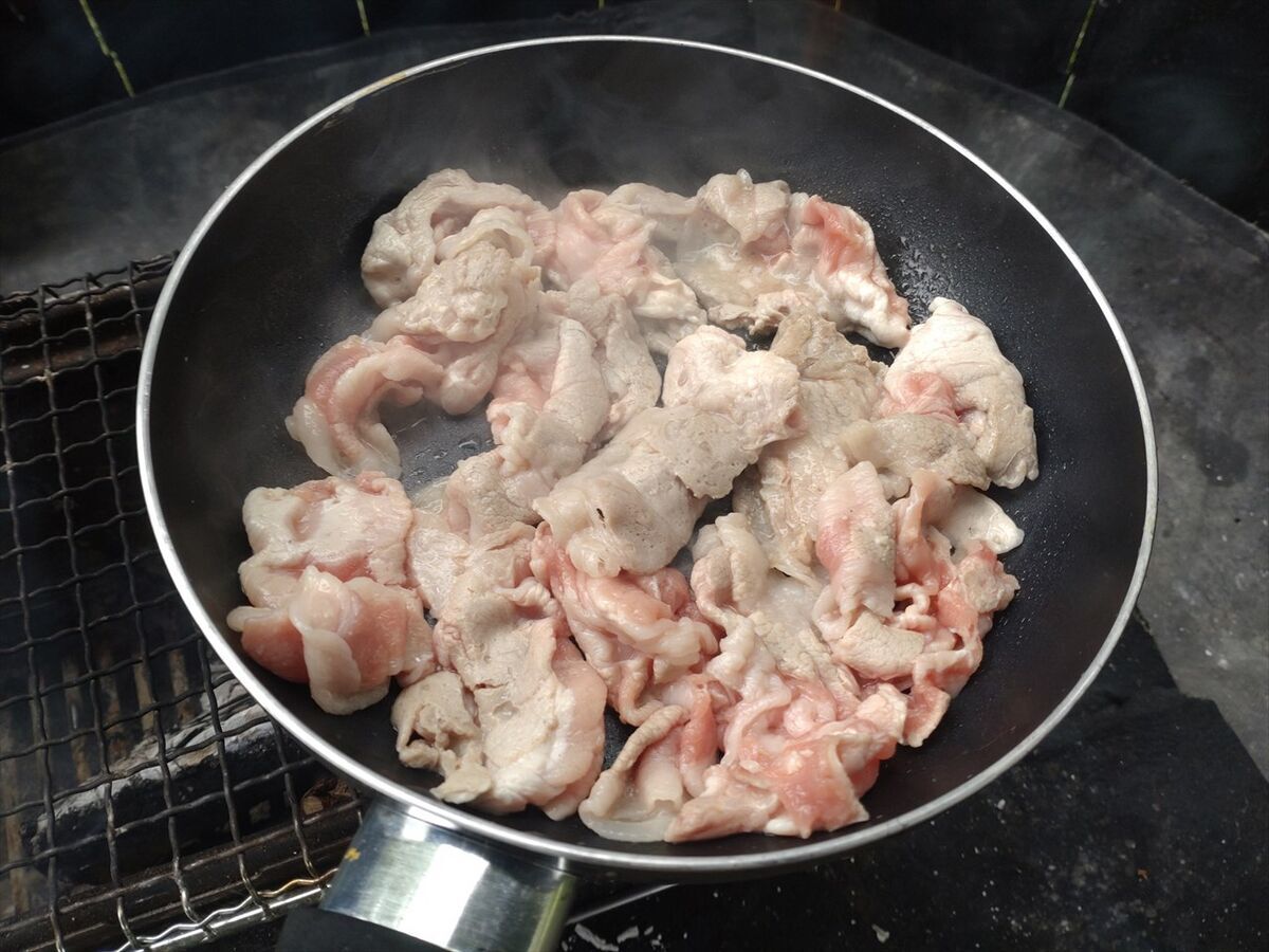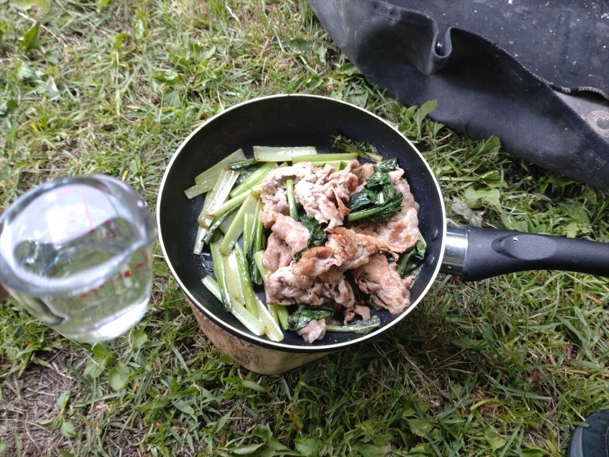 フライパンで湯を沸かしレトルトご飯とカレーを温めます。
