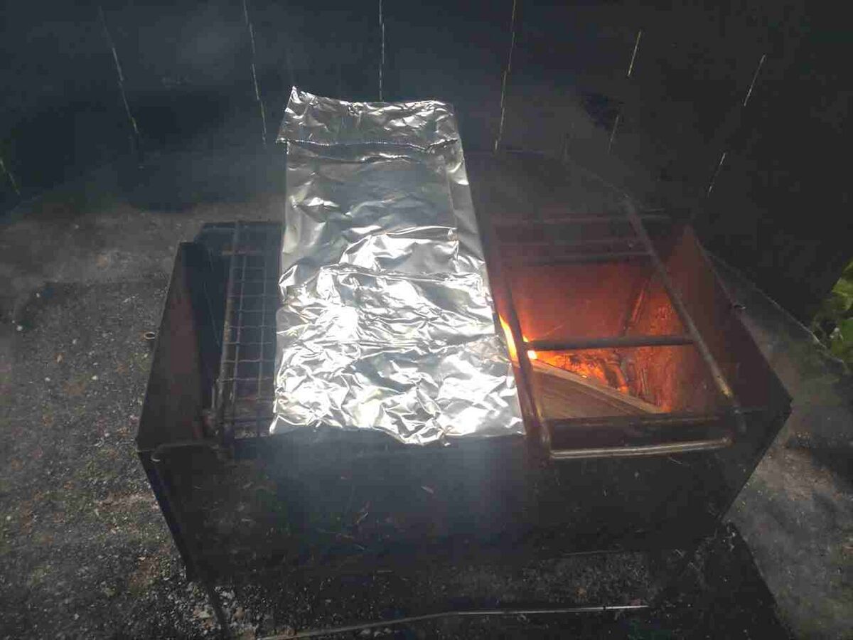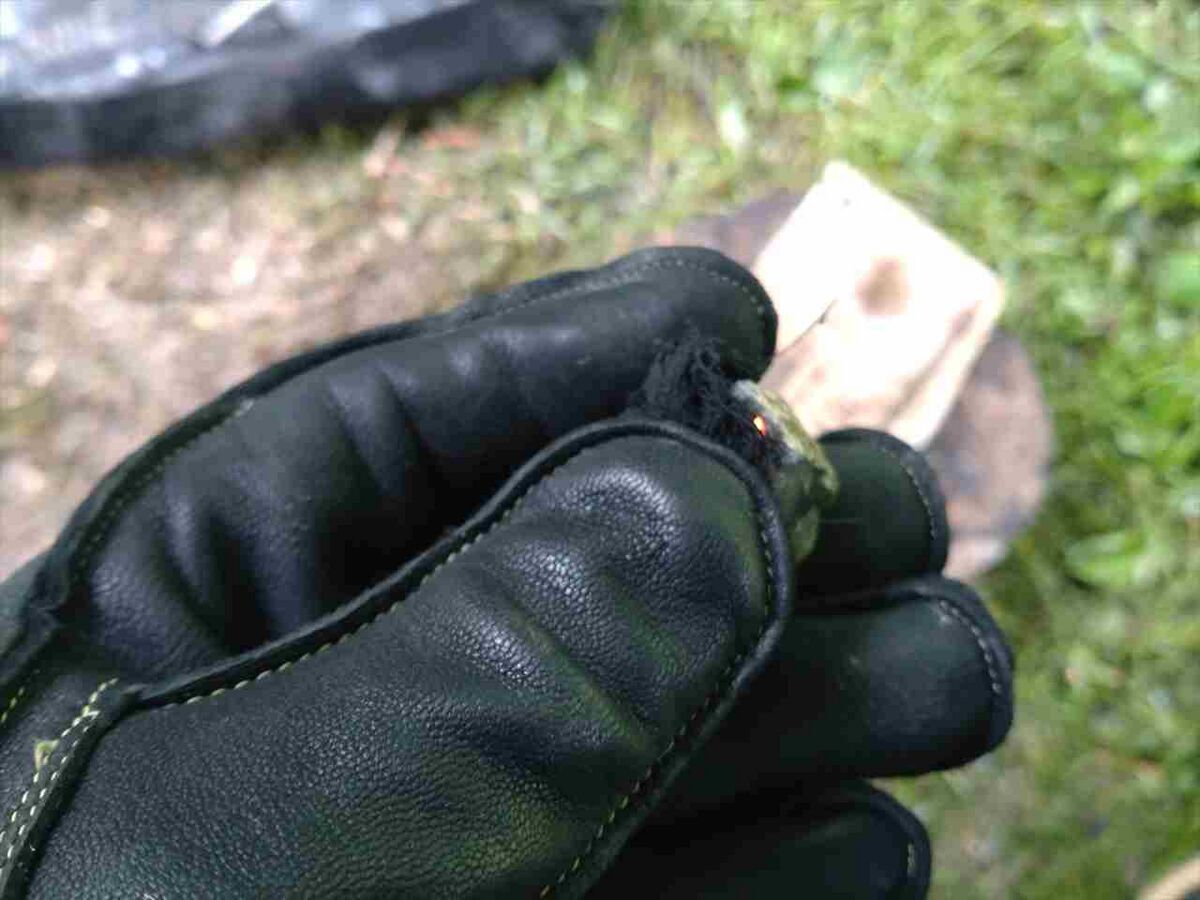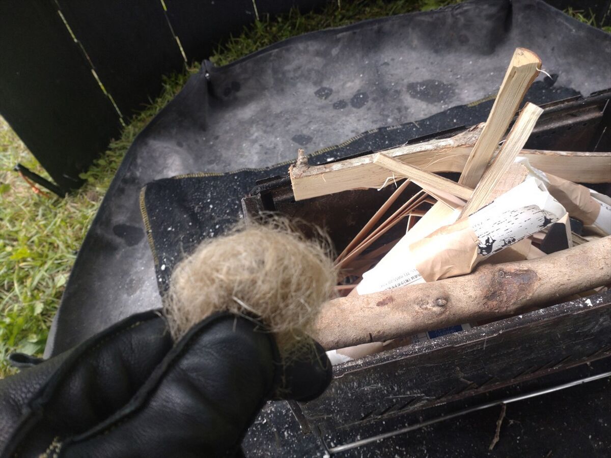 雨で湿気るのでどうかなと思いましたが、何度か火打石を叩くうちにチャークロスに点火しました(^^)