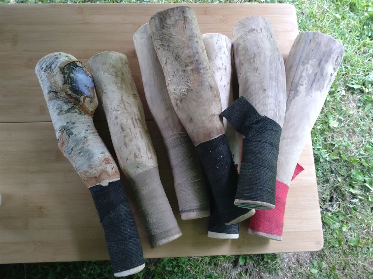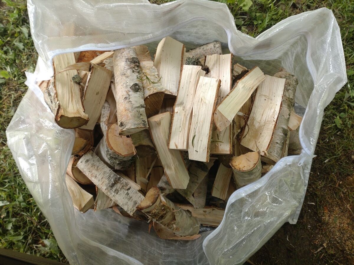 何もせずタープが乾くのを待つのも退屈なので、いただいた白樺の枝を割って薪作りをしましょう(^^)