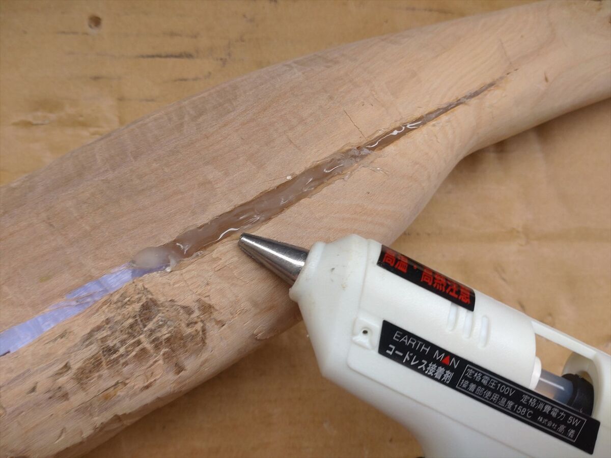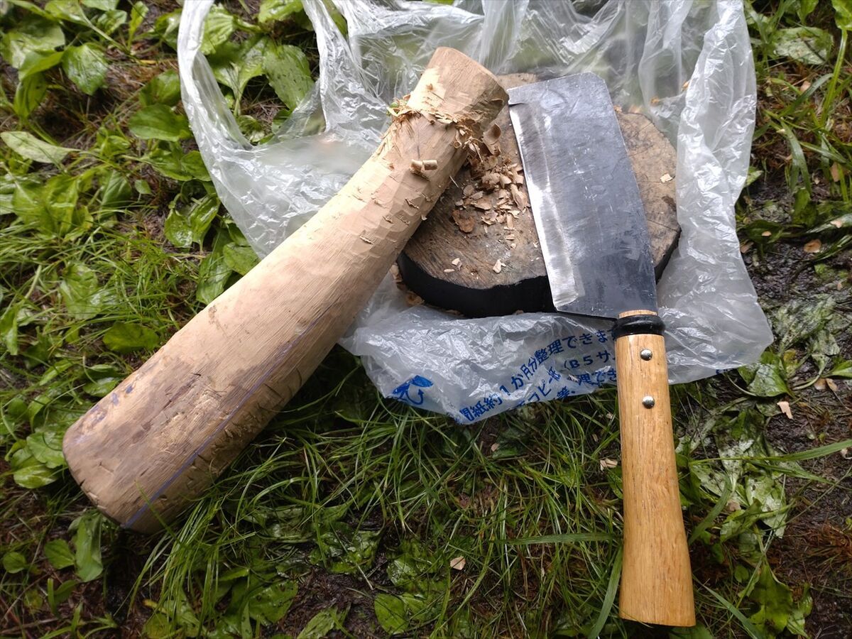 小型のナタでは木がうまく削れず、初代の重いナタを使って軽く打ち付けながら木を削ります。