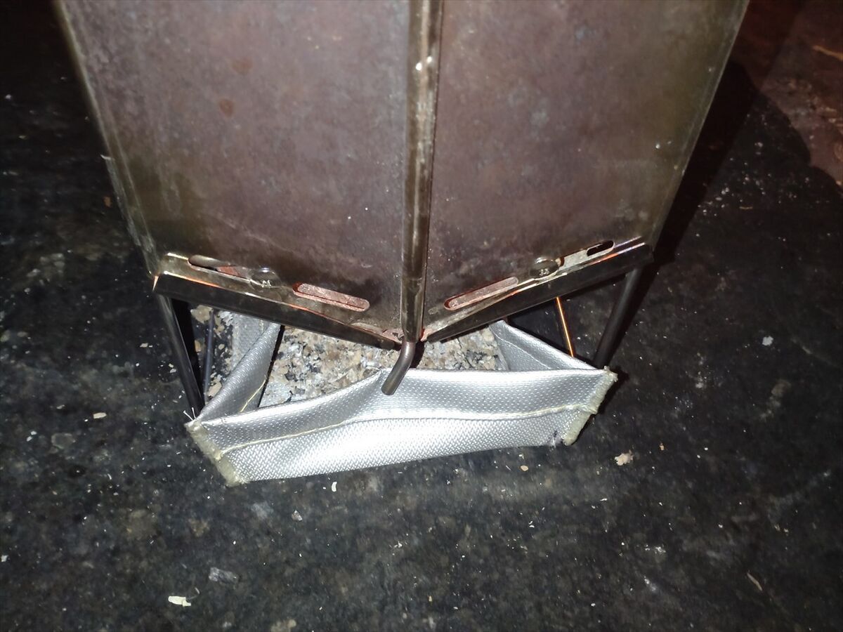 底を再び閉じるためにステンレス棒を差し込みますが、棒や焚火台がかなり熱くて革手袋では火傷しそうです。とりあえず焚火シートの端で挟んでつかみましたが、閉じるのが難しいですね(^^;