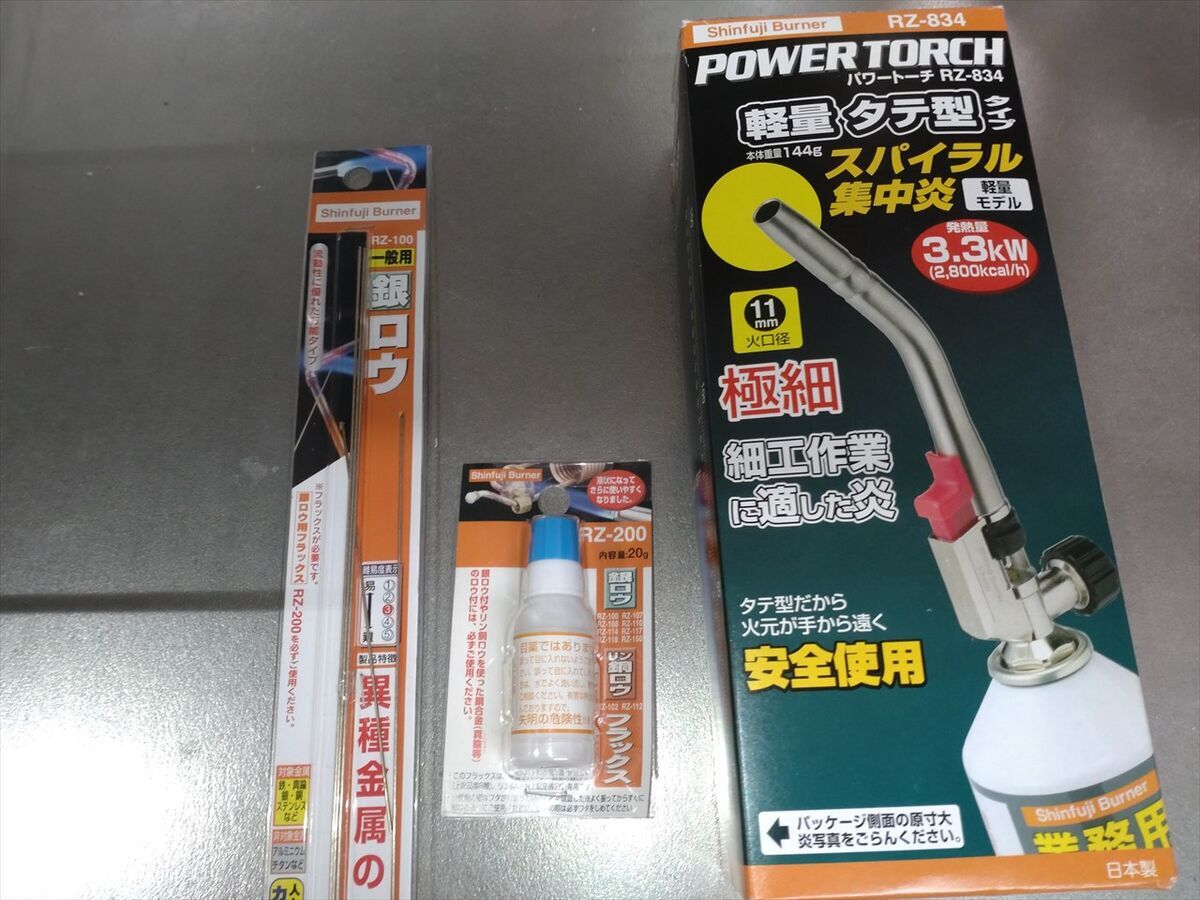 パワートーチ、ガスボンベ、銀ロウ、フラックスです。