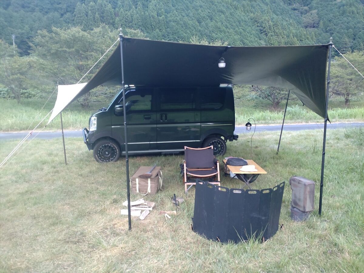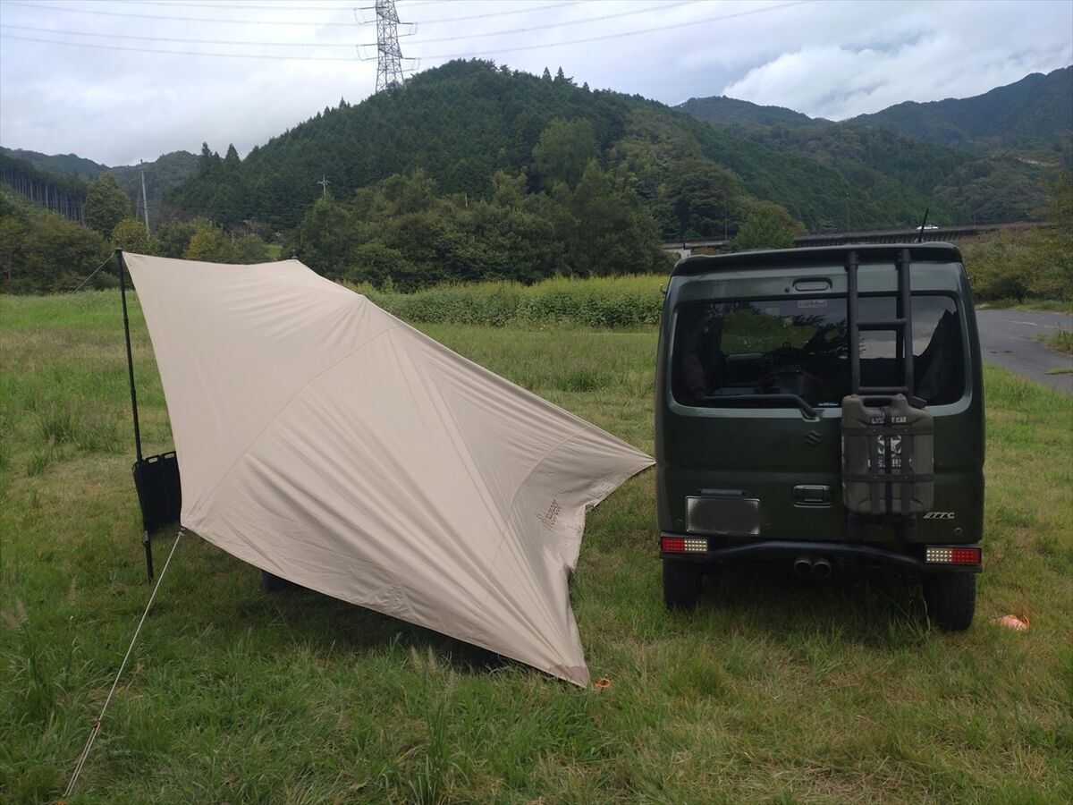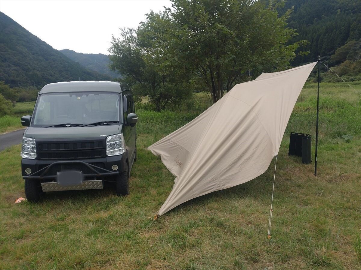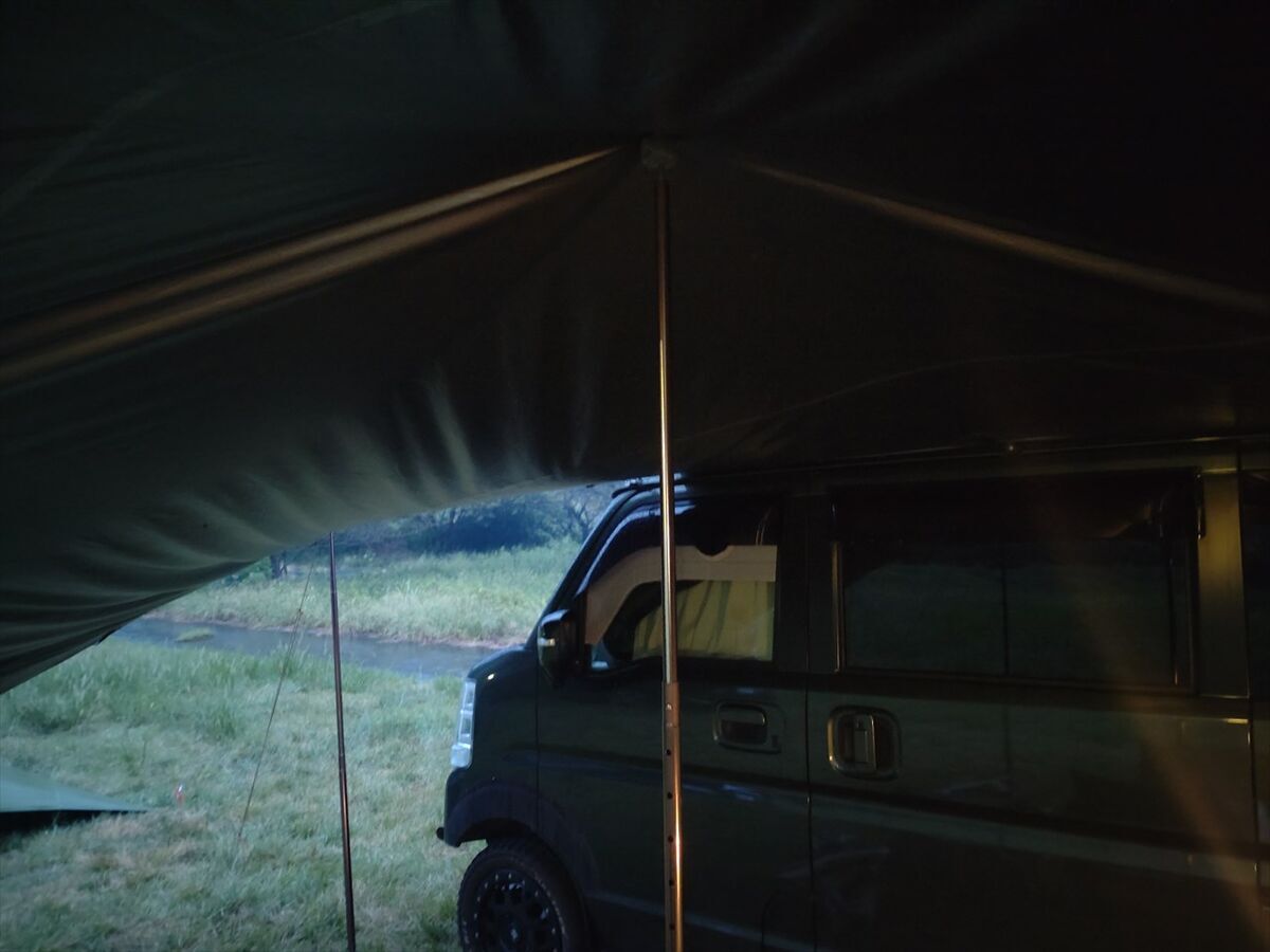 風に耐えるように手前側のポールを少し低くして軽キャンパーに連結しました。