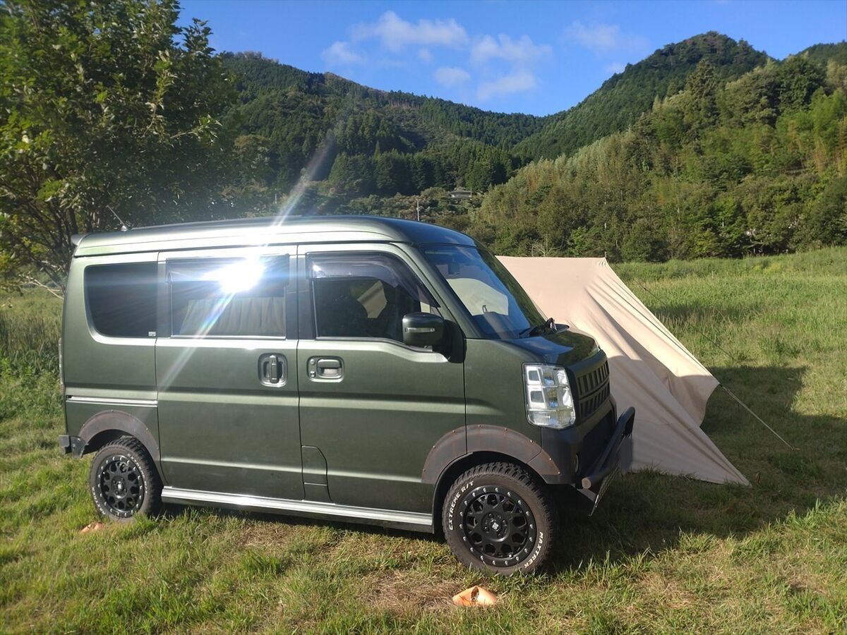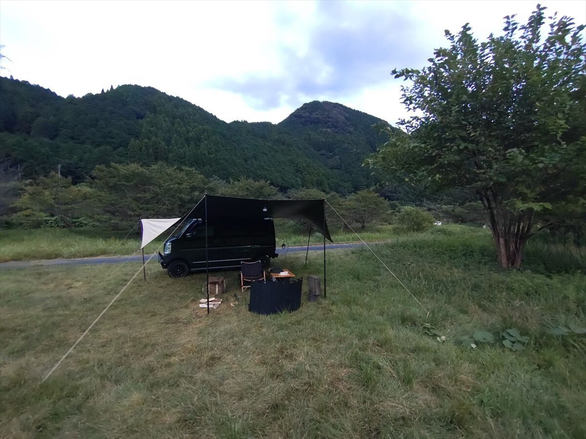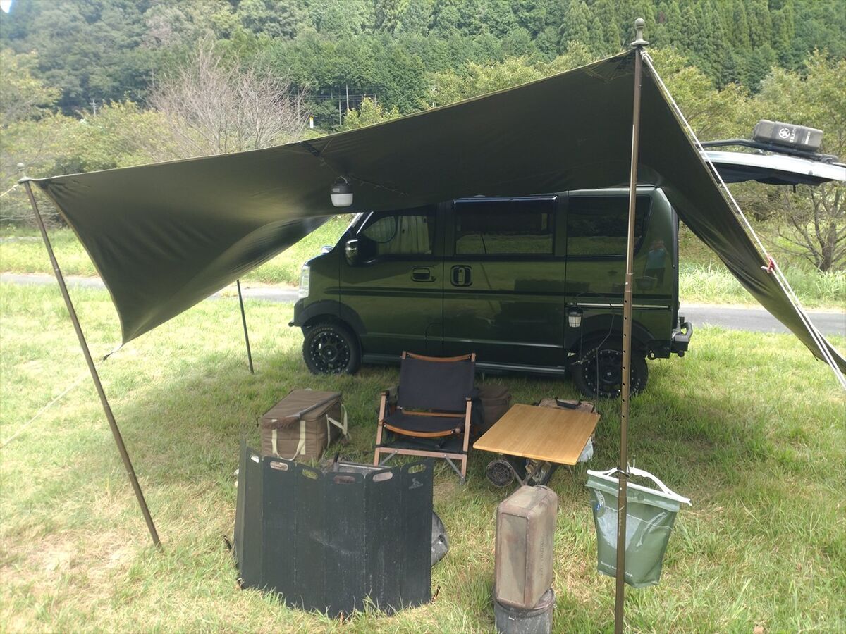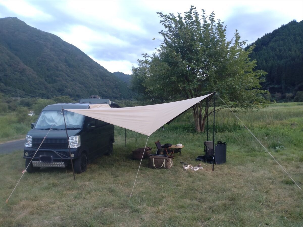 風に耐えるように手前側のポールを少し低くして軽キャンパーに連結しました。