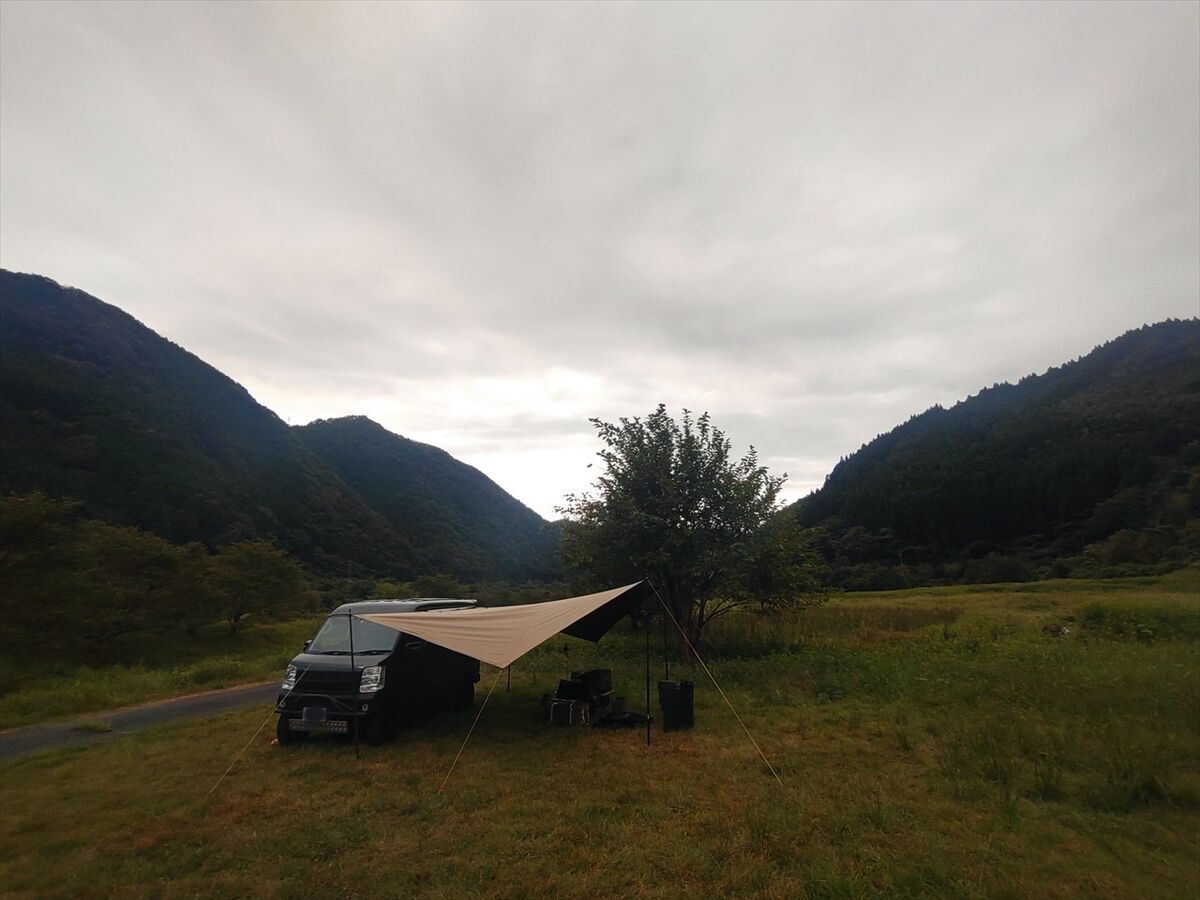 車外に出てみるとタープが夜露でぐっしょり濡れています。