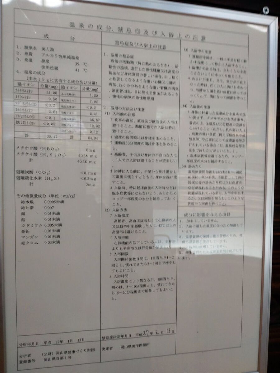 温泉分析表です。アルカリ性単純温泉(低張性アルカリ性低温泉)と書いてあります。