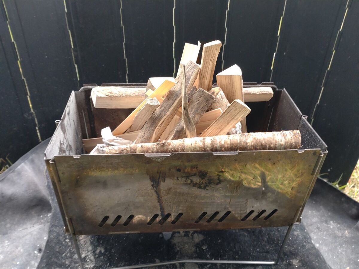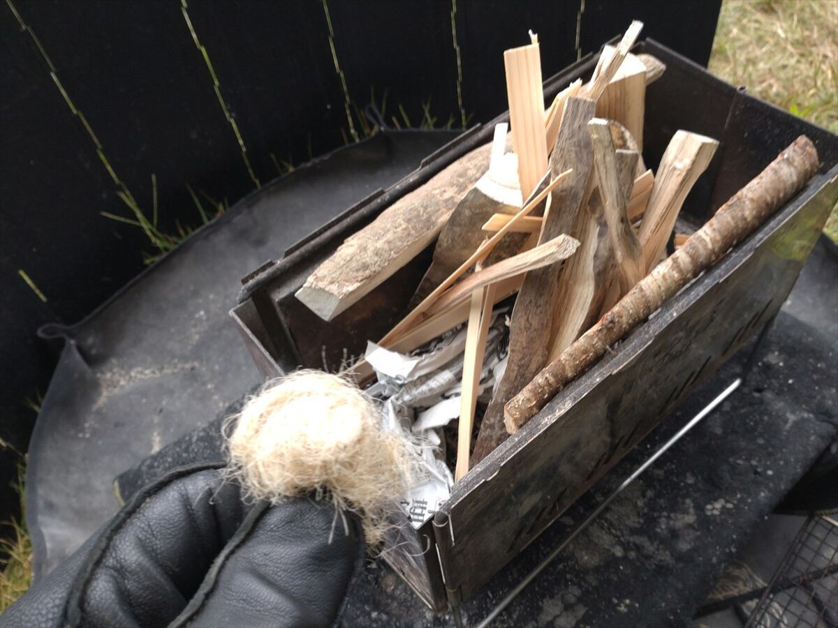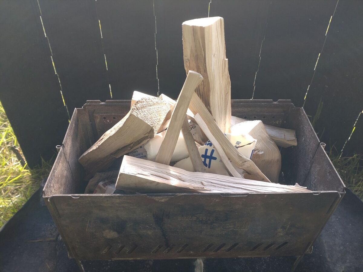新聞紙を細長く丸めた上に牛乳パックを破いたものを丸めて載せて、周りに薪を載せています。