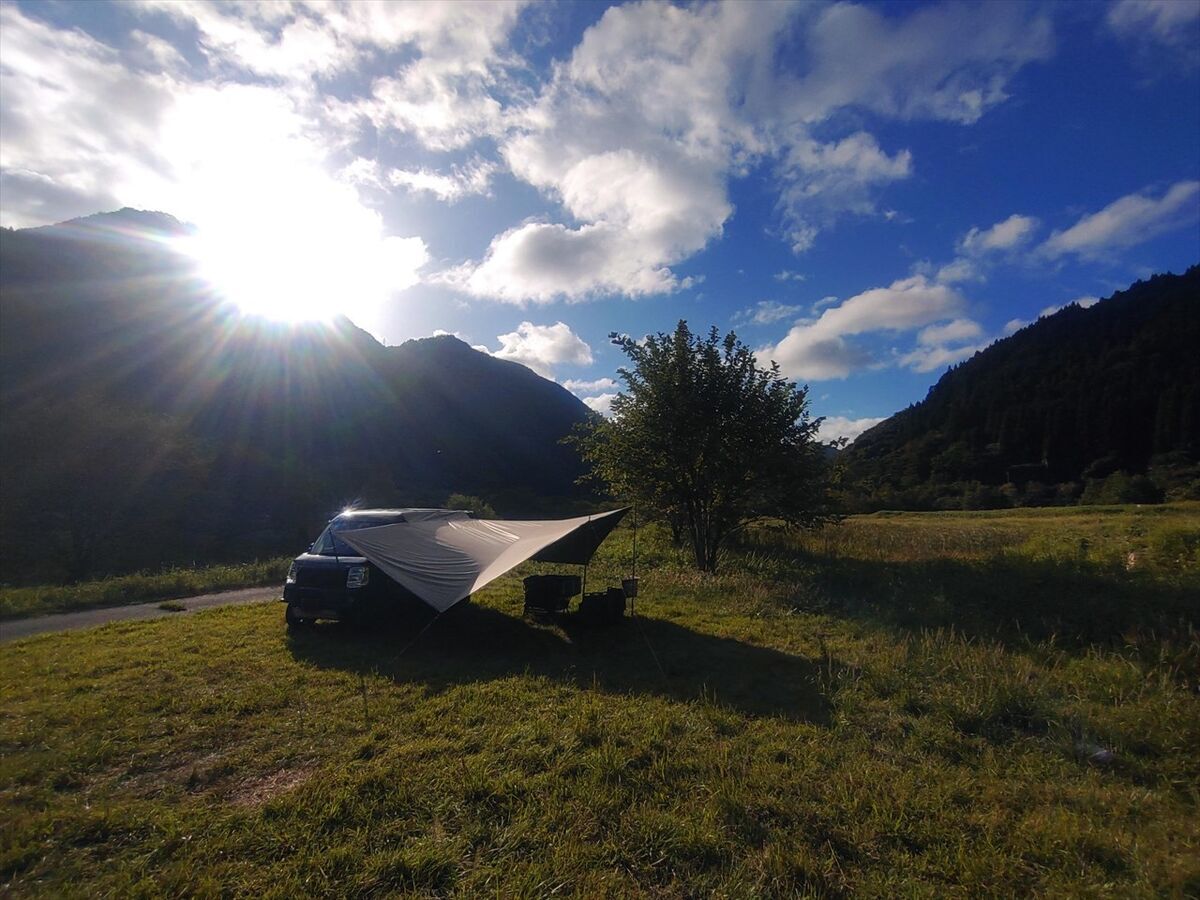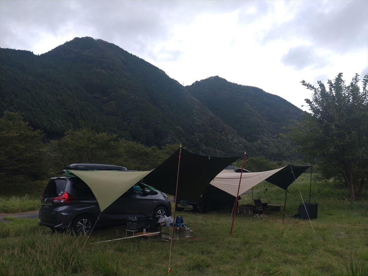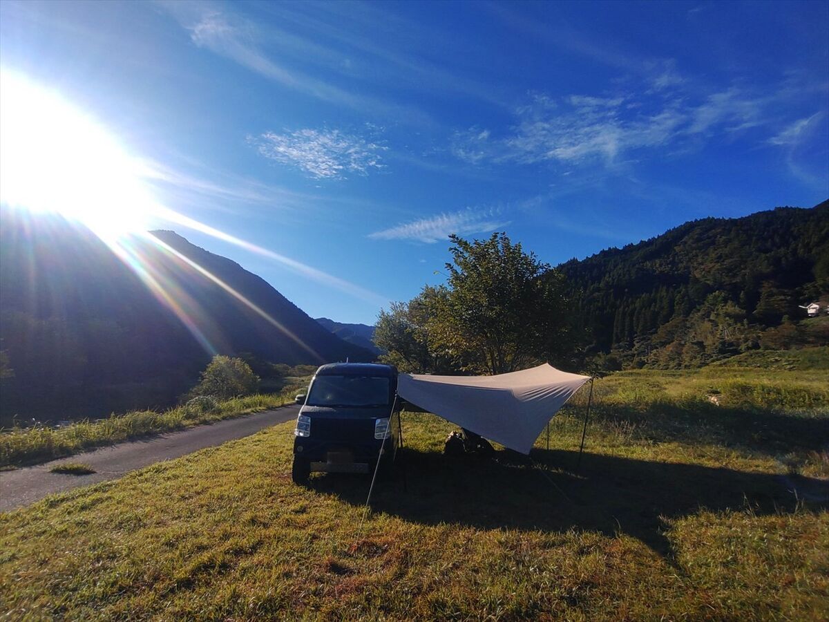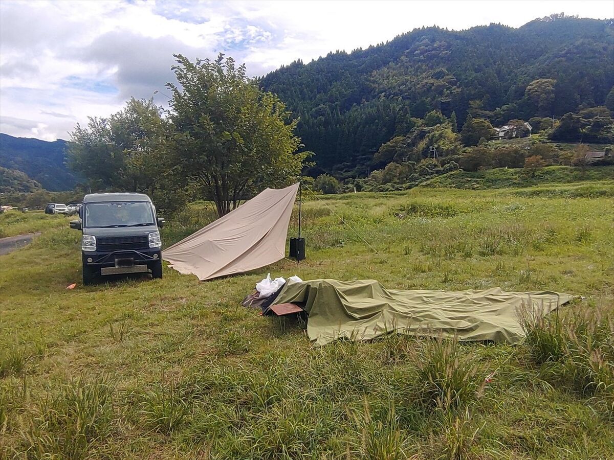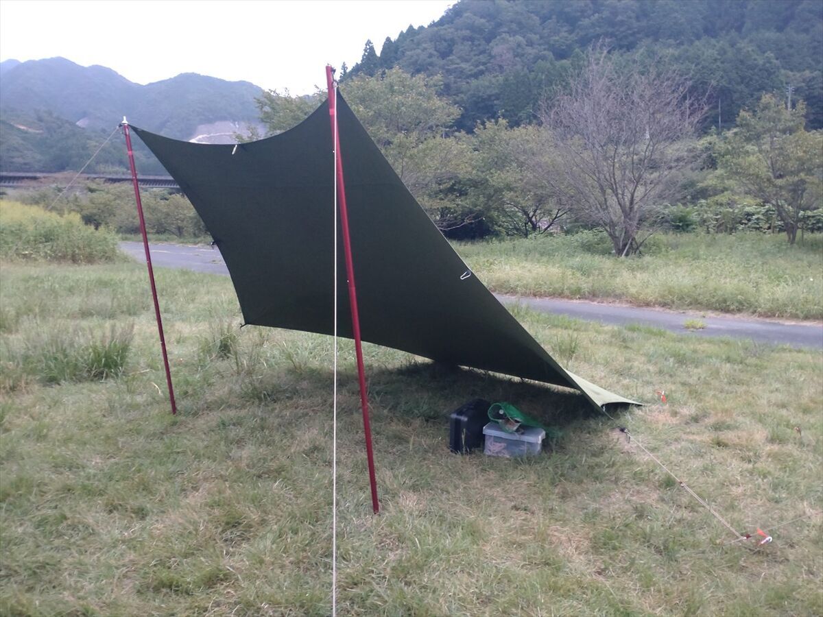 とても良い天気なのでとりあえずタープ連結だけ外して乾かしている間に、車でトイレ前の駐車場に行ってきます。