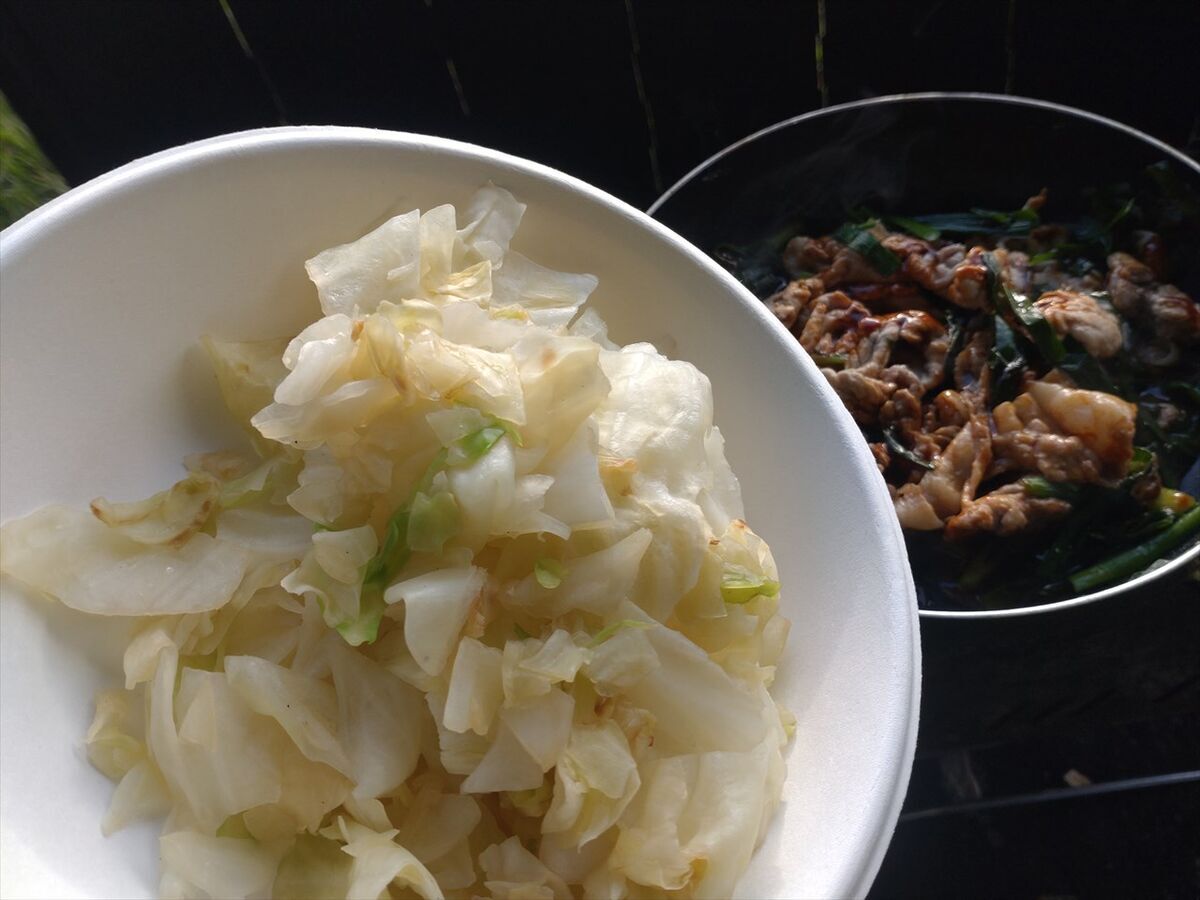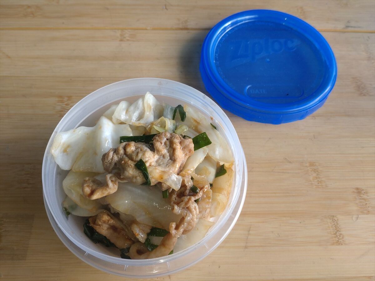 今朝の分のおにぎりが足りなかったのもあり、昨日取り分けておいた回鍋肉も電子レンジで温めていただきます(^^)