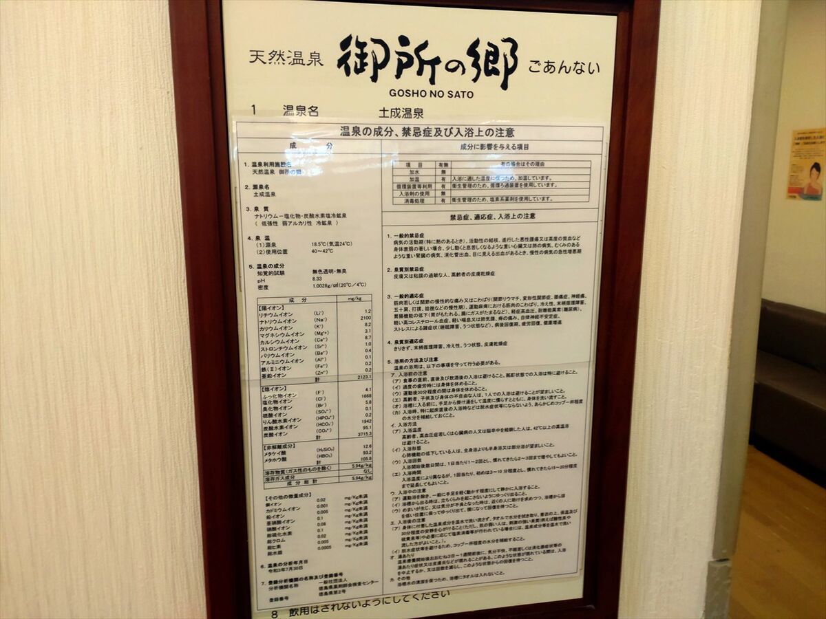温泉分析表です。ナトリウムー塩化物・炭酸水素塩冷鉱泉(低張性弱アルカリ性冷鉱泉)と書かれています。