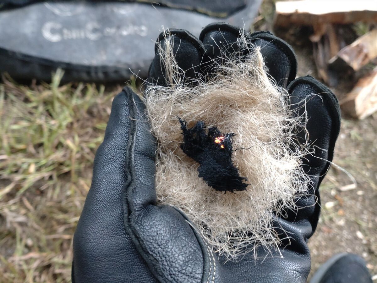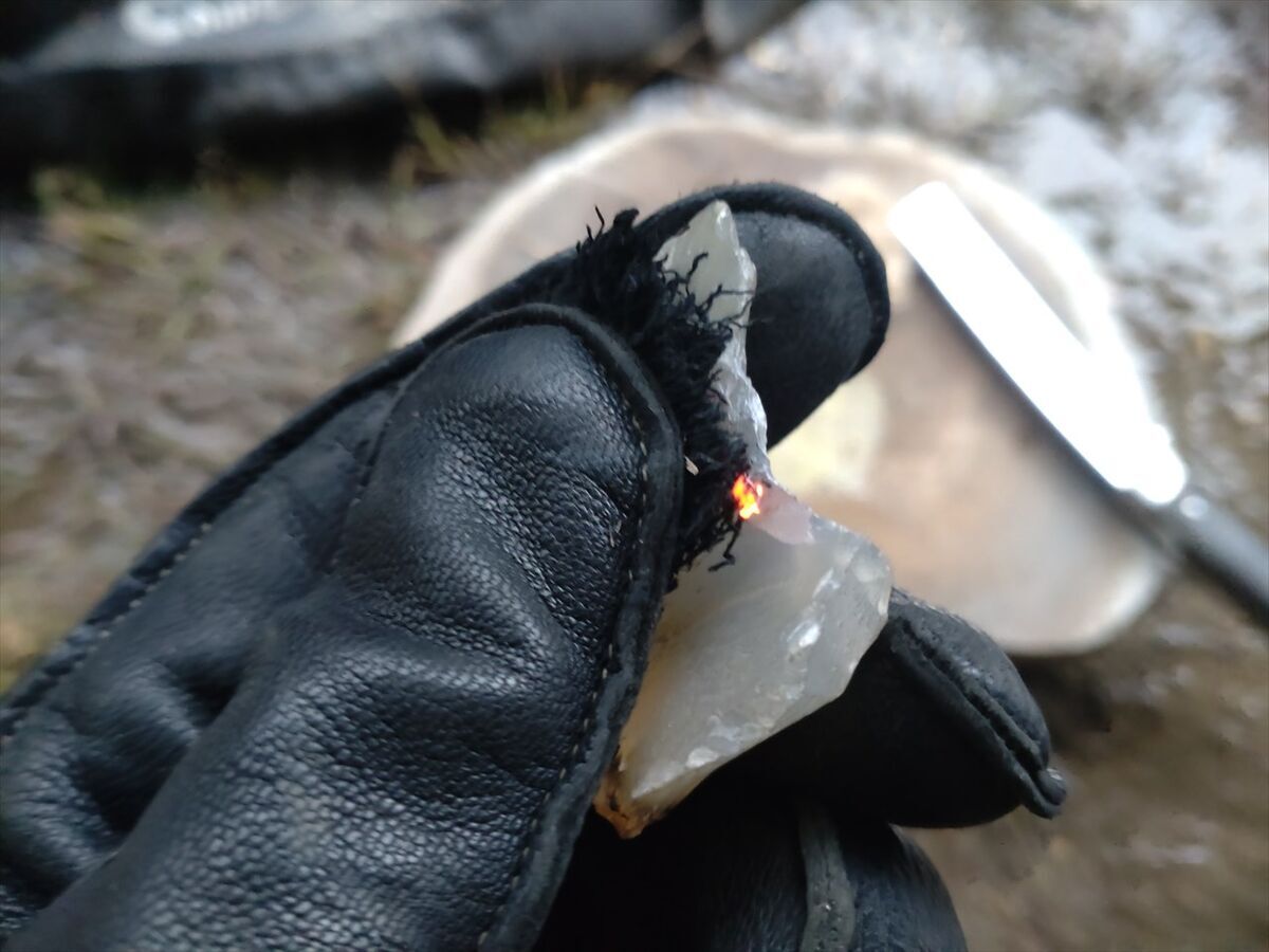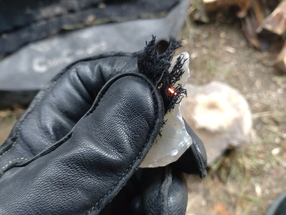 湿気りやすいのかすぐには点火せず、それでも数度火打鎌を火打ち石に打ち付けたら火花がチャークロスに点火しました(^^)