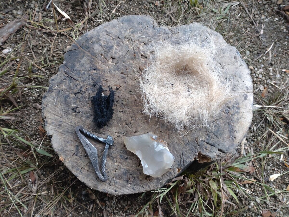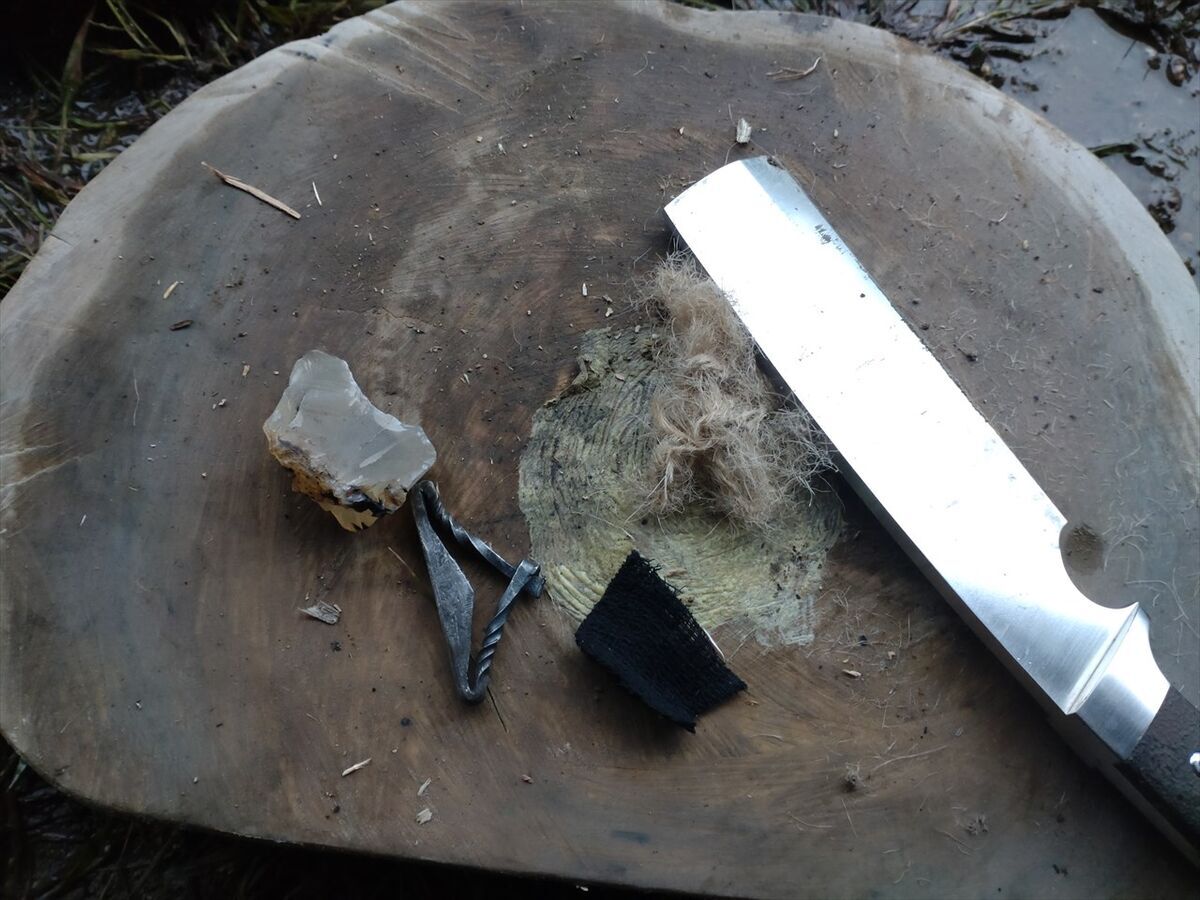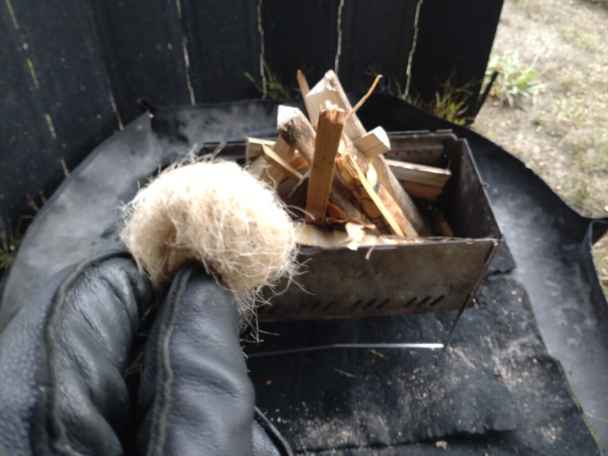 湿気りやすいのかすぐには点火せず、それでも数度火打鎌を火打ち石に打ち付けたら火花がチャークロスに点火しました(^^)