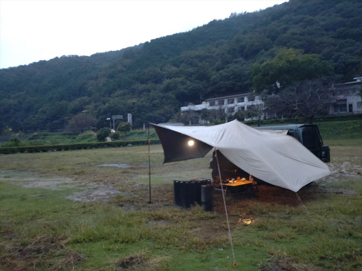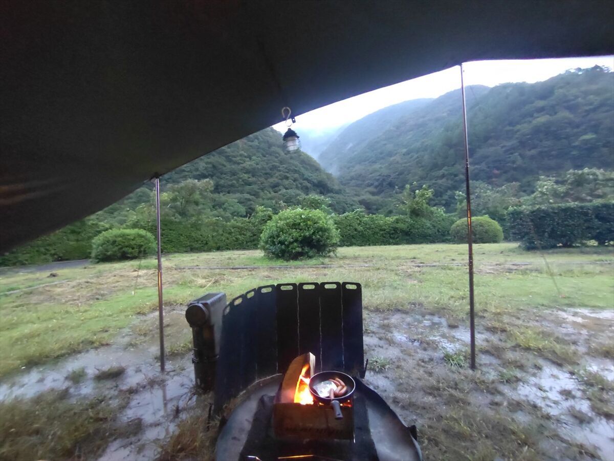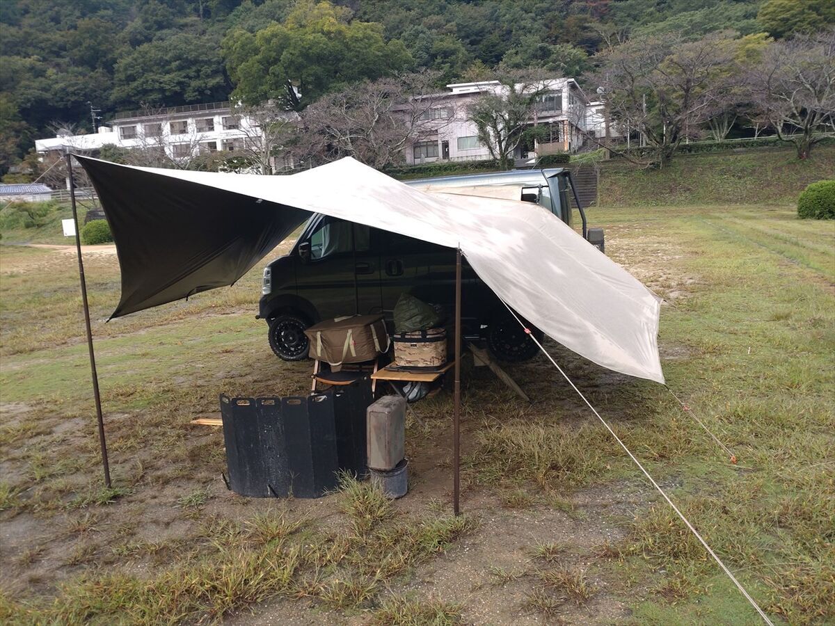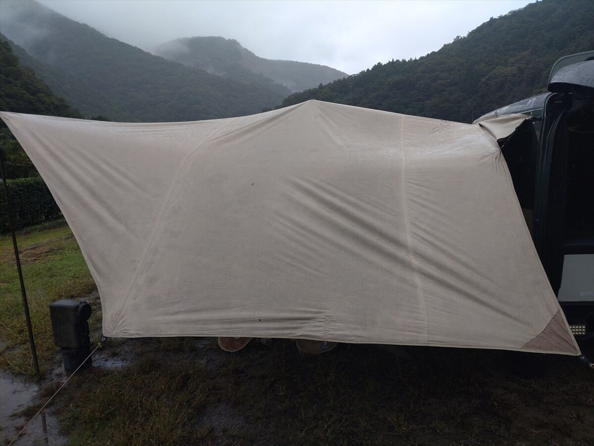 タープを張り終えてから雨風が強くなってきました。まだ持ってる!