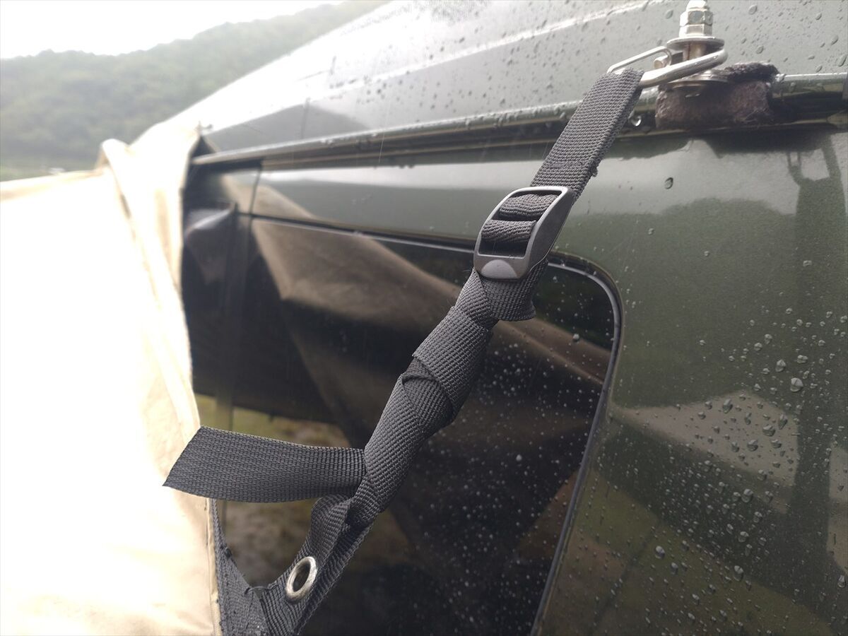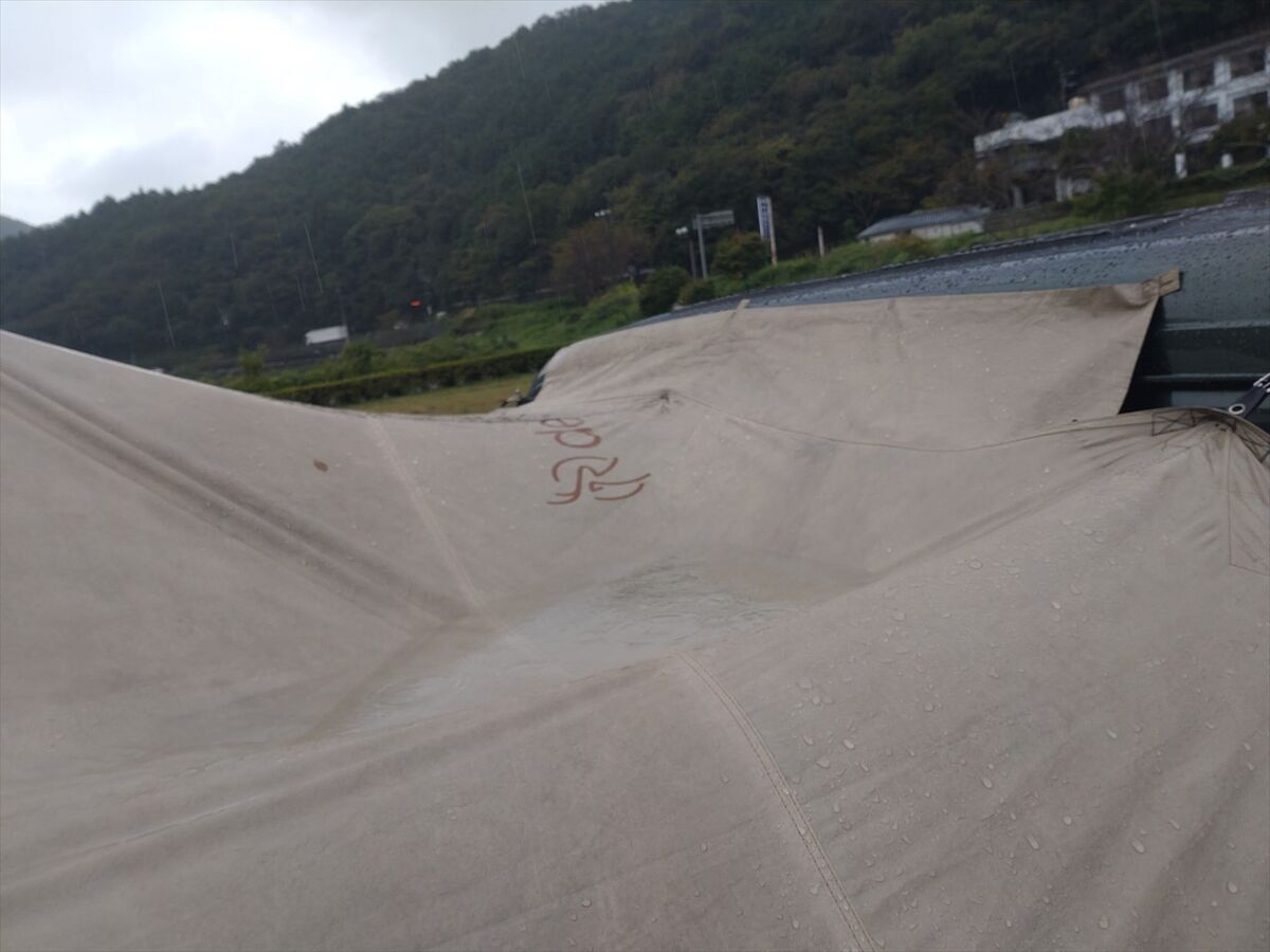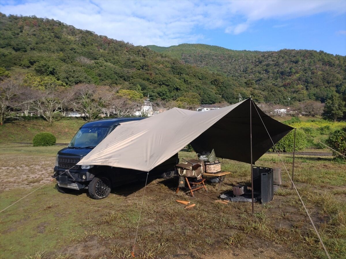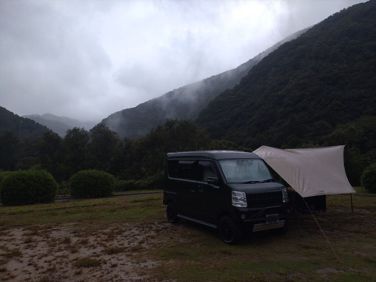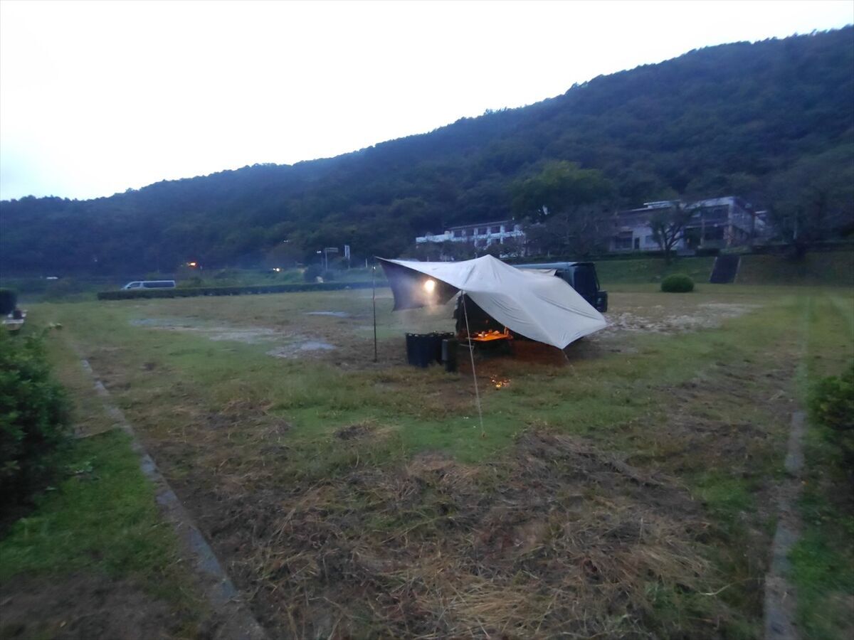 タープを張り終えてから雨風が強くなってきました。まだ持ってる!