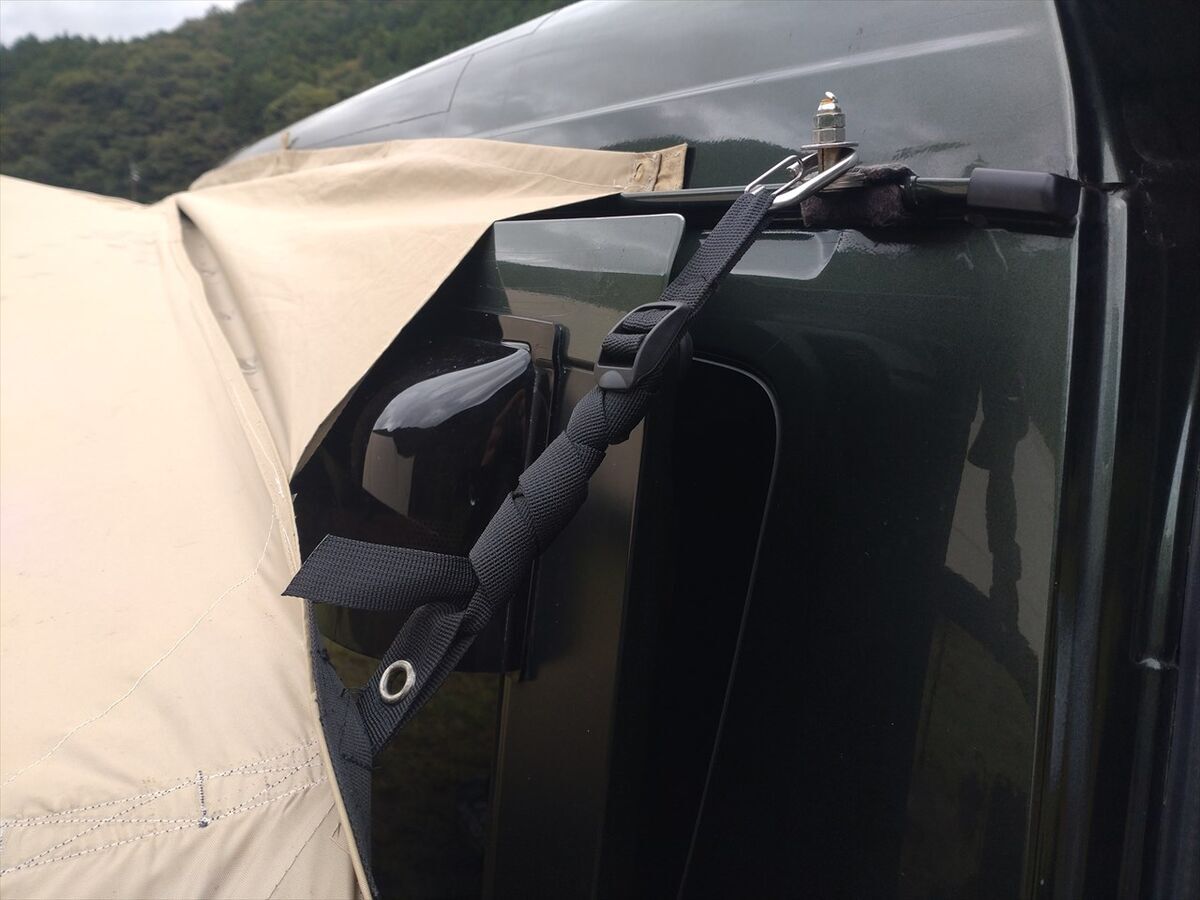 車の向きを変えてここでタープ連結をしましょう。