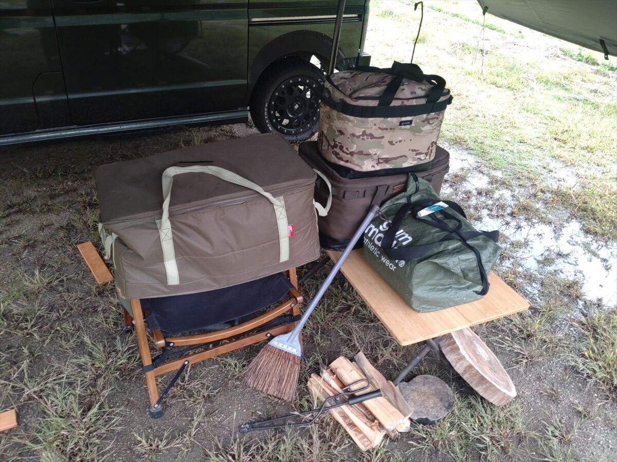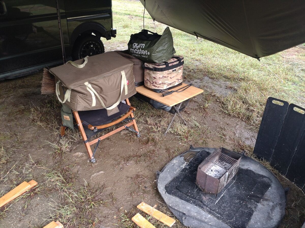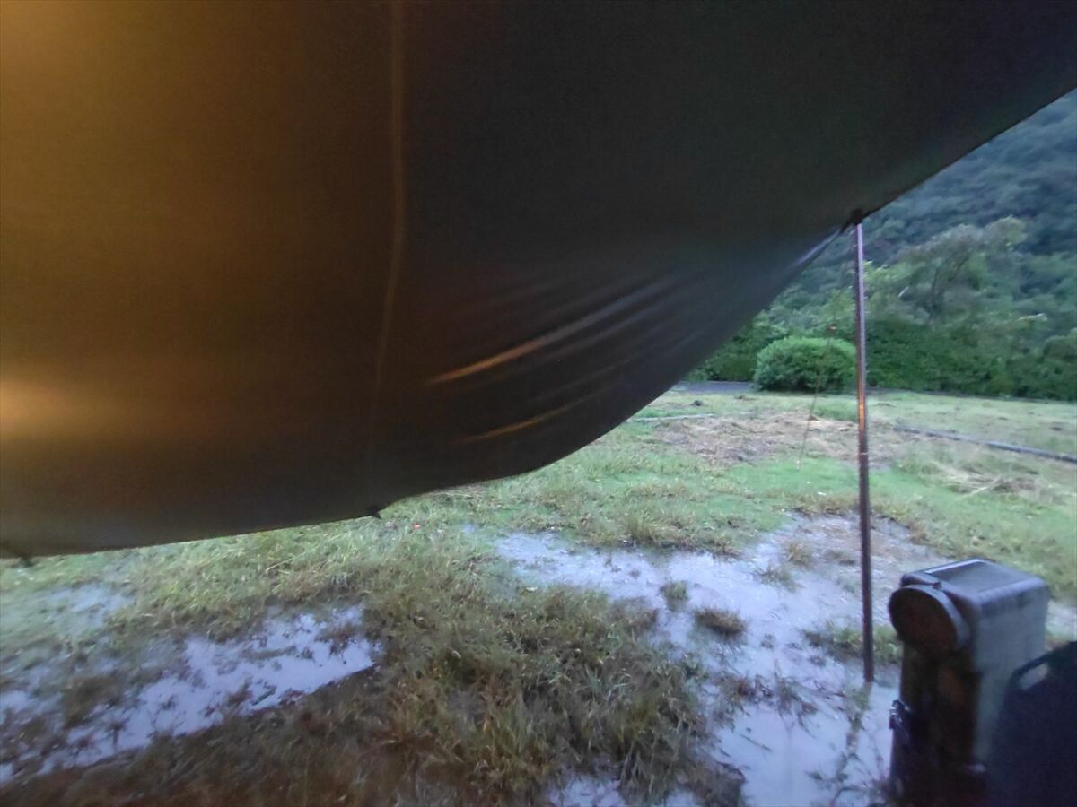 昨夜はタープの範囲まで水たまりが出来ていましたが、バッグなどは高い場所に移動させておいたので特に影響はありませんでした(^^)