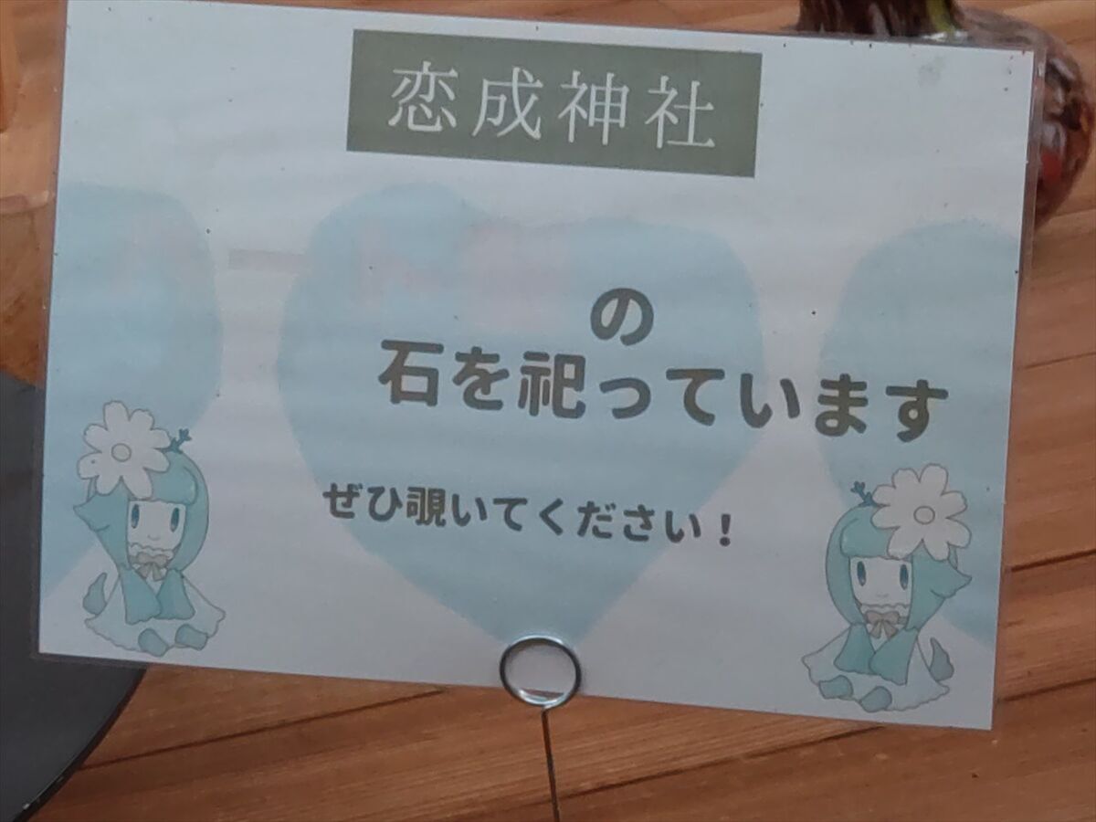 字が薄くなり良く見えませんが「ハート型の石を祀っています」と書かれています。