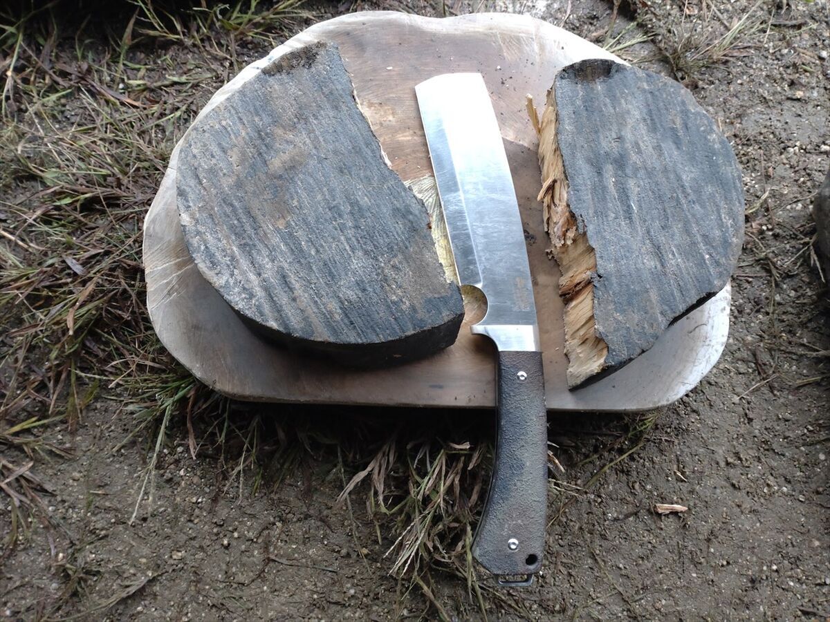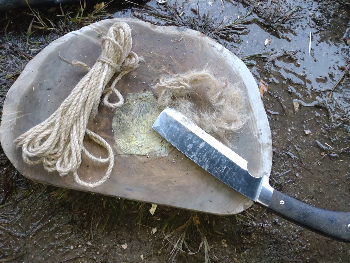 最初は麻ロープをナタの刃で擦ってほぐします。
